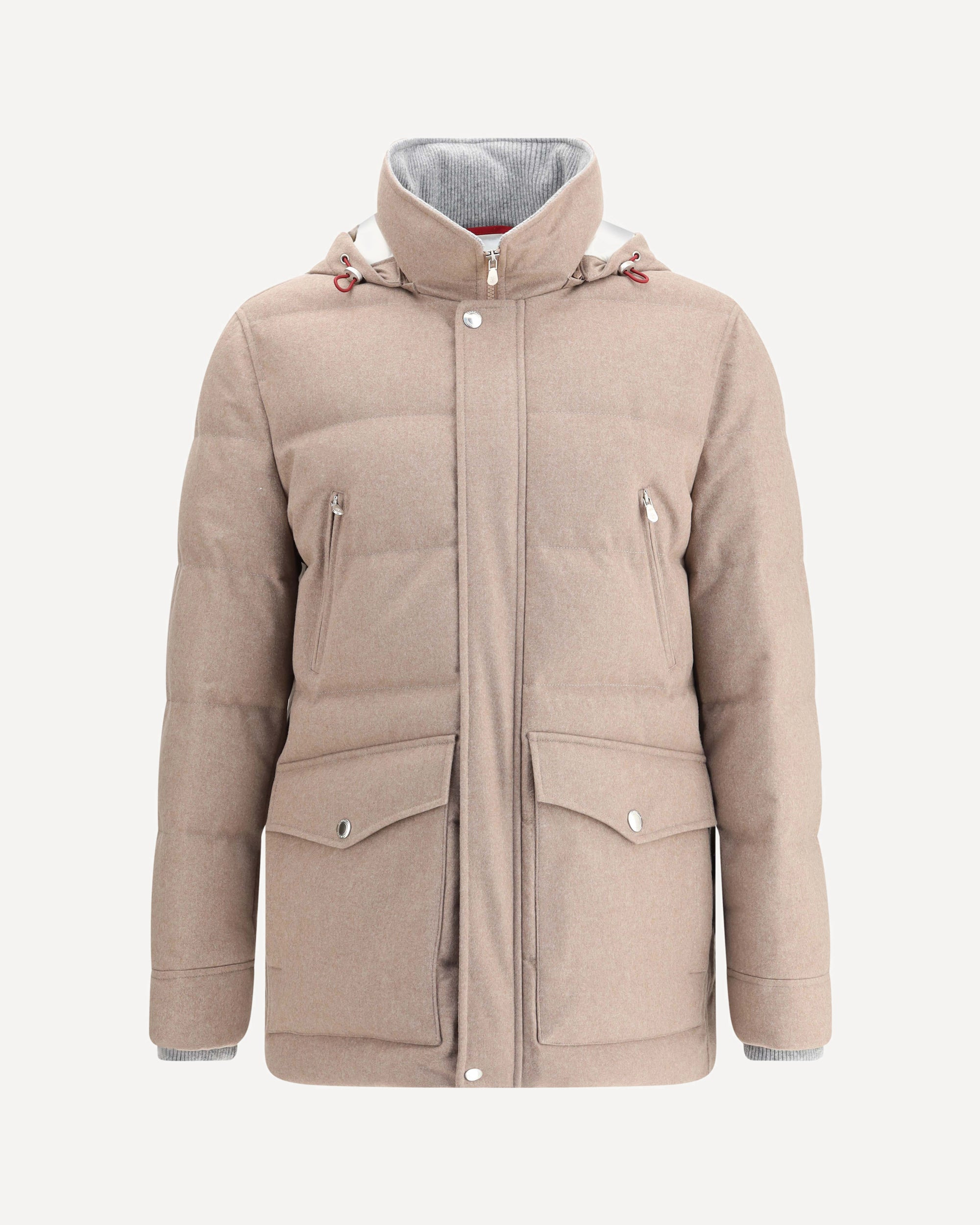 Brunello Cucinelli's cashmere Down Jacket is a refined expression of functional elegance. Made of fine cashmere, with a midi silhouette and thoughtful details, it combines warmth and style. The zipper and snap-button closure complements practical front flap pockets and zippered welt pockets. The adjustable and removable hood adds versatility, making it perfect for tackling winter with understated sophistication. DETAILS - Sku: MM4701823_CBK06 - Season: AW25 - Fit: Regular - Composition: OUTER 100% Kashmir/capra Hircus INNER 100% Duck Down - MADE IN ITALY