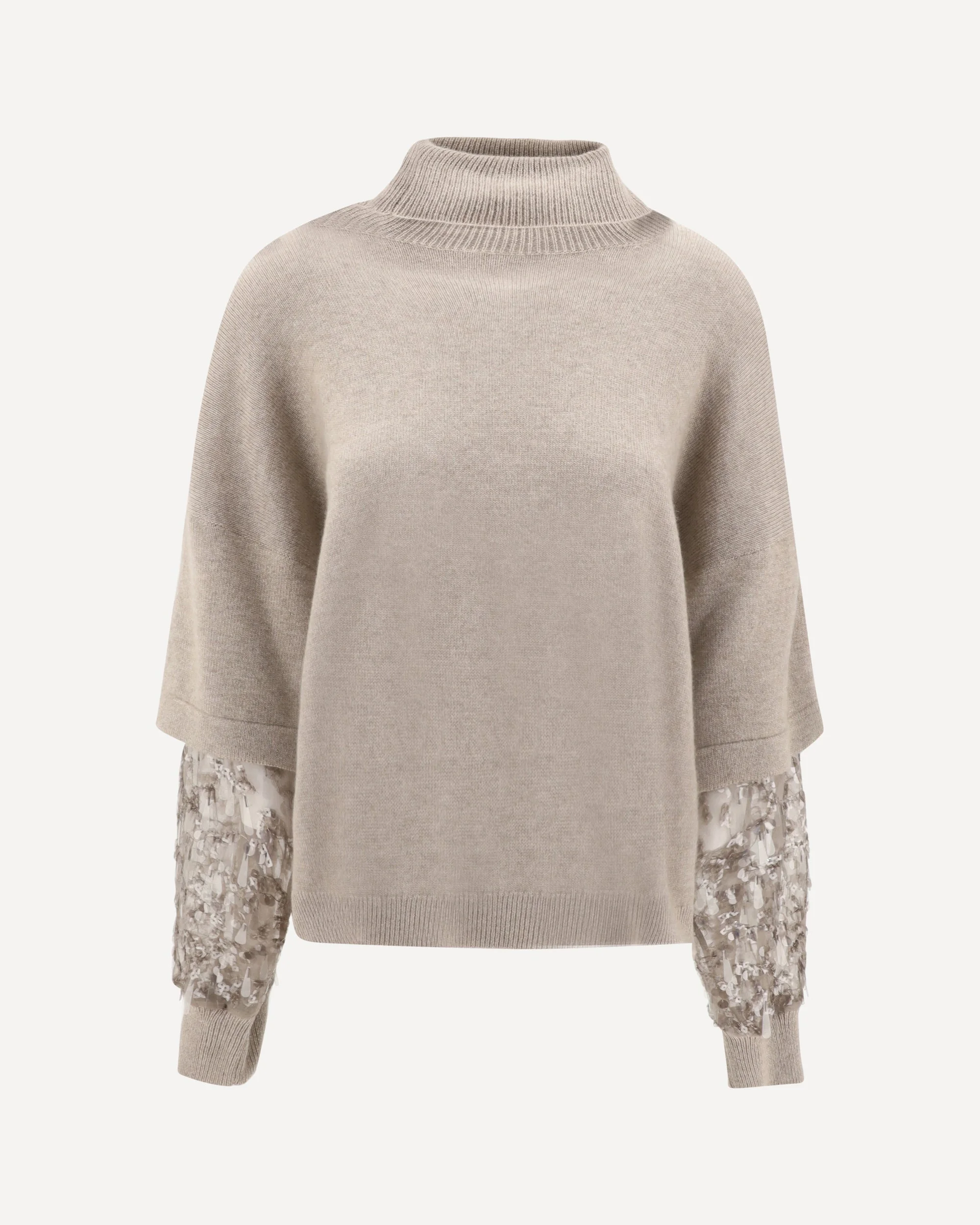 Brunello Cucinelli's cashmere turtleneck Sweater is a sophisticated and stylish piece featuring a ribbed high collar that offers comfort and style. The dropped sleeves give a relaxed look, while the high ribbed cuffs and hem add definition to the design. A unique detail is the double layer on the sleeves, with a ribbed short-sleeve top and a semi-transparent fabric bottom, embellished with sequins that add a touch of sparkle to the garment. The oversized fit makes the sweater comfortable and modern, perfect for an elegant yet relaxed look. DETAILS - Sku: M12730003_C077 - Season: AW25 - Fit: Regular - Composition: GENERAL 100% Calf Leather Bos Taurus - MADE IN ITALY
