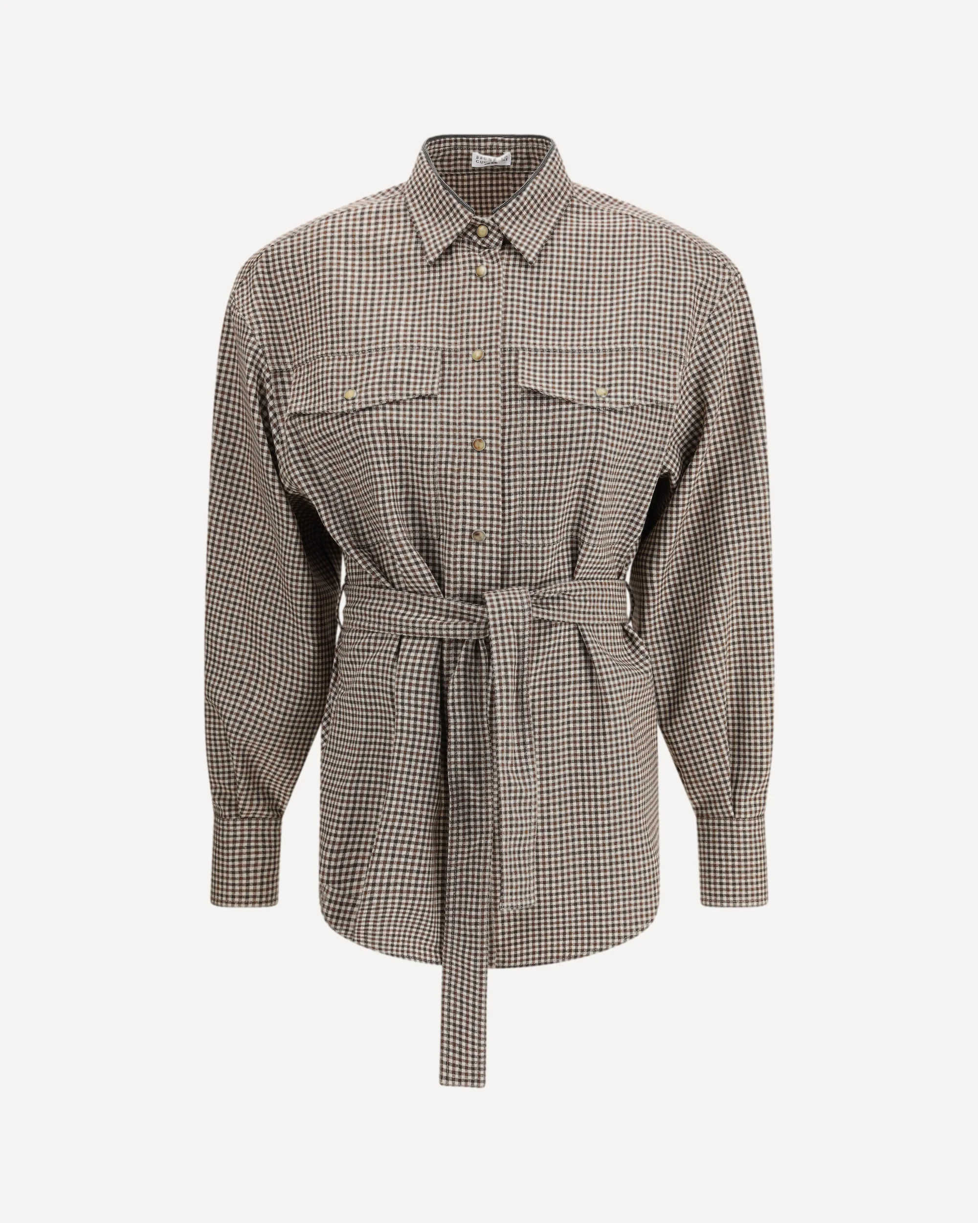 The checked virgin wool Shirt by Brunello Cucinelli embodies a refined balance of tradition and modern femininity. The country-inspired check pattern evokes a timeless charm, while the soft fit with voluminous sleeves and dropped shoulders lends an elegant reinterpretation of classic menswear. The removable belt gently defines the waist, and the monile embroidery on the collar adds a delicate sparkle — a signature element that enhances the shirt with the distinctive elegance of the Brunello Cucinelli aesthetic. DETAILS - Sku: MB149MQ206_C001 - Season: AW25 - Fit: Regular - Composition: GENERAL 100% Fleece Wool - MADE IN ITALY