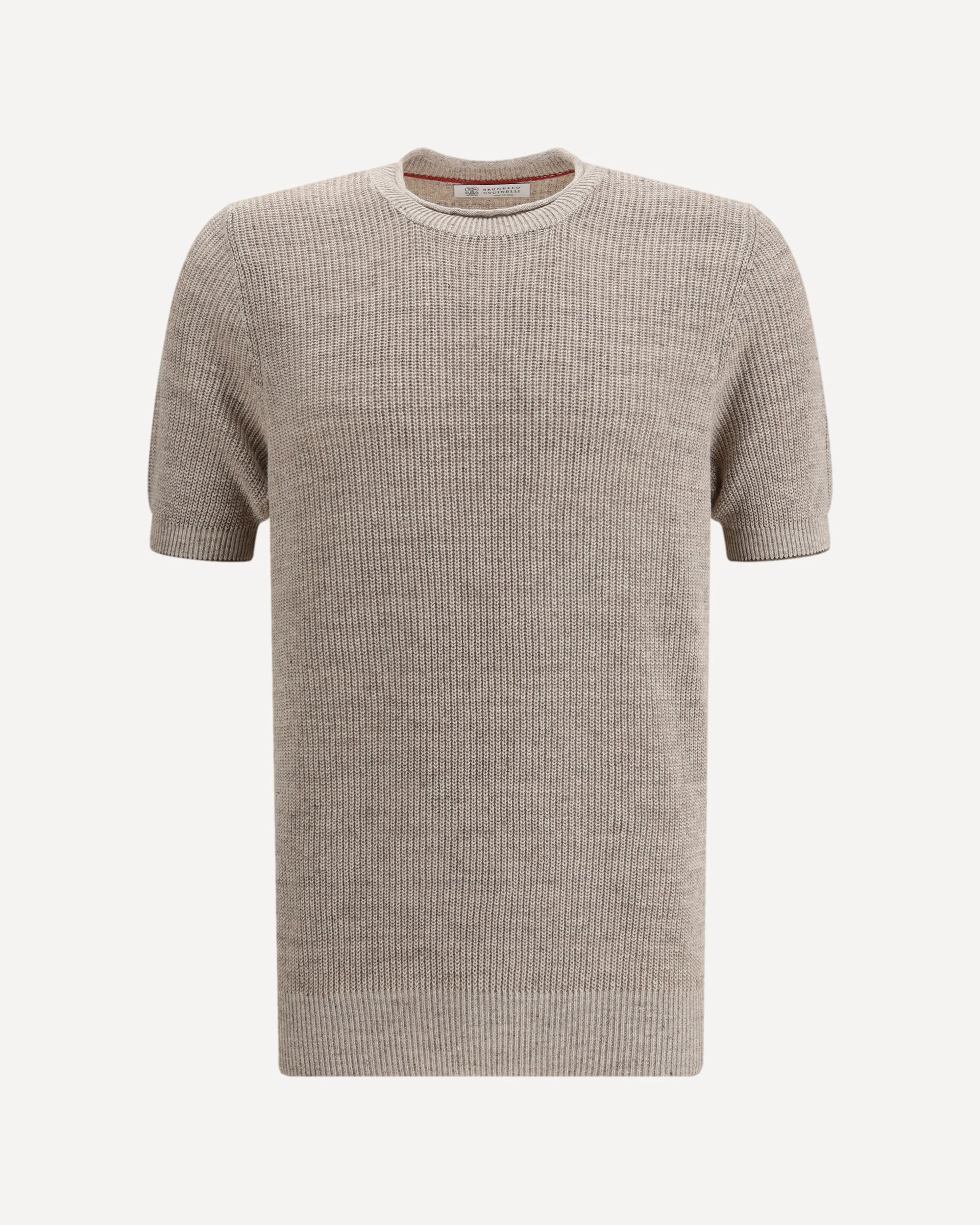 The knit T-Shirt by Brunello Cucinelli combines the lightness of linen with the comfort of cotton in a refined English half-rib knit. The design features a clean cut with a ribbed finished hem for the perfect balance of casual style and refined craftsmanship. Ideal for casual elegance in the warmer months. DETAILS - Sku: M2L707710_CAY04 - Season: SS26 - Fit: Regular - Composition: GENERAL 70% Linen 30% Cotton - MADE IN ITALY
