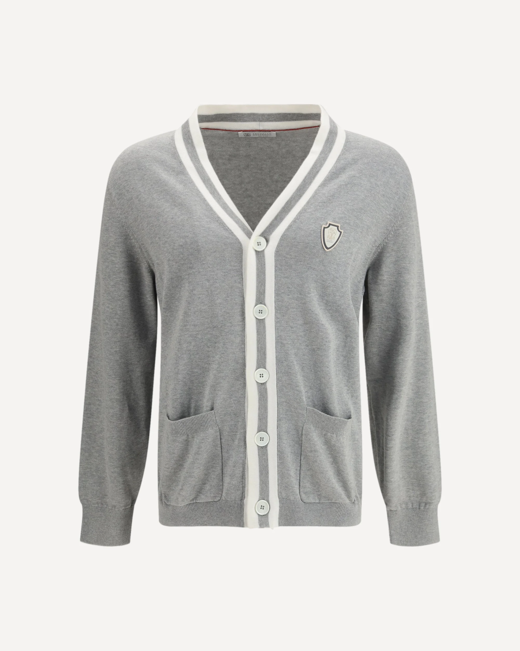 The V-neck cotton Cardigan by Brunello Cucinelli with front pockets is an iconic piece that combines elegance and practicality. It features a v-neck on the front, button closure and two welt patch pockets. The unmistakable monogram patch is applied on the chest, adding a distinctive touch. Ribbed cuffs and hem complete the design for a comfortable, finished fit. DETAILS - Sku: M29203606F_CP157 - Season: SS26 - Fit: Regular - Composition: GENERAL 100% Cotton - MADE IN ITALY