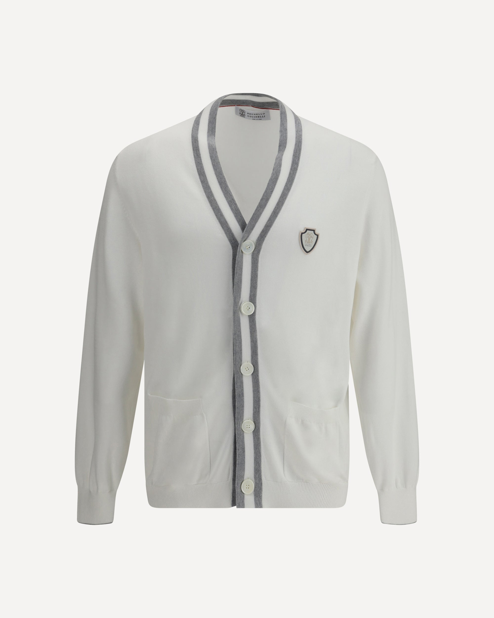 Brunello Cucinelli's V-neck cotton Cardigan with front pockets is an iconic piece that combines elegance and practicality. It features a v-neck on the front, button closure and two welt patch pockets. The unmistakable monogram patch is applied on the chest, adding a distinctive touch. Ribbed cuffs and hem complete the design for a comfortable, finished fit. DETAILS - Sku: M29203606F_CJ068 - Season: SS25 - Fit: Regular - Composition: GENERAL 100% Cotton - MADE IN ITALY
