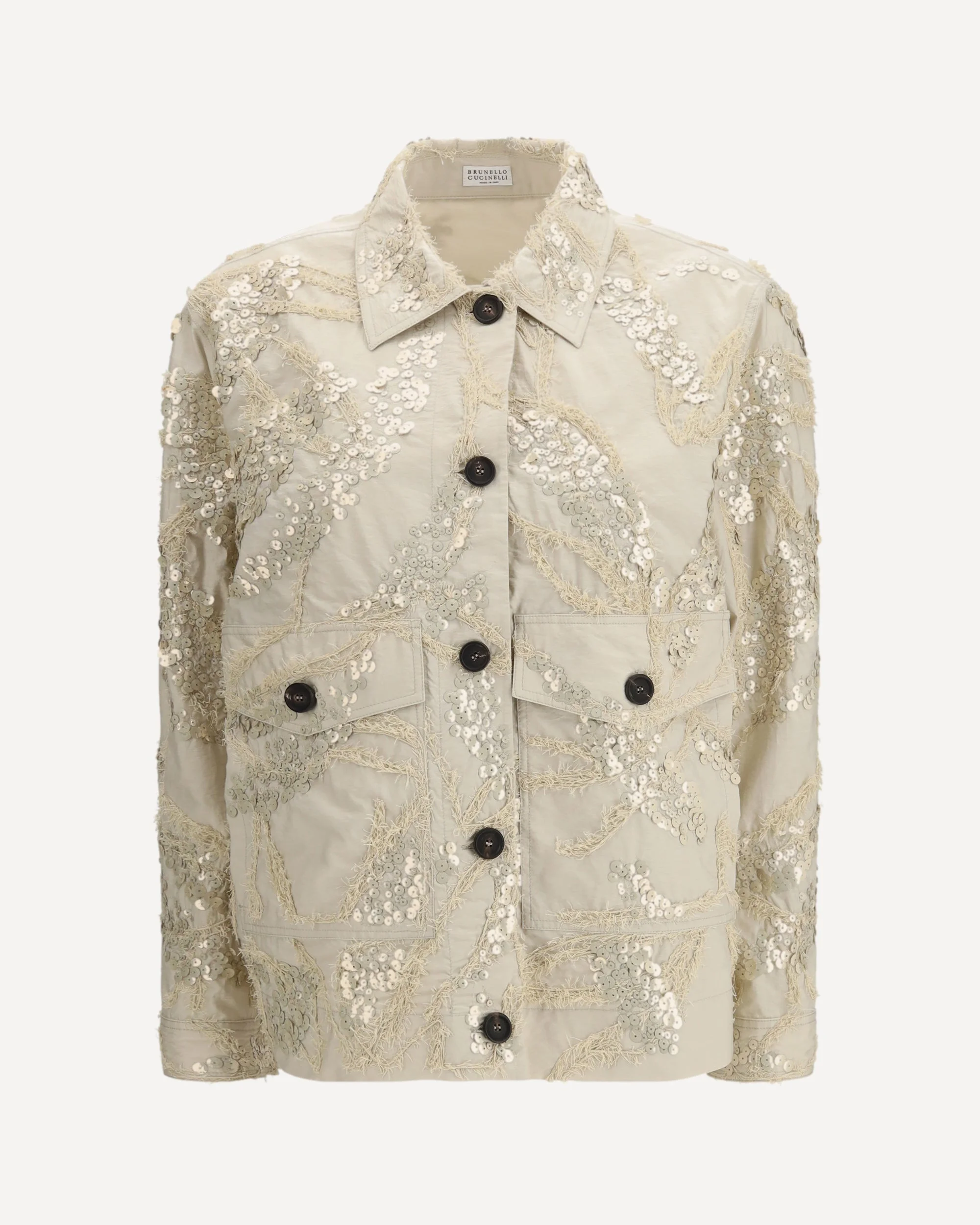 The embroidered and sequined Jacket by Brunello Cucinelli delivers a refined elegance with strong visual impact. Crafted from a cotton-blend fabric, it features a structured classic collar and a front button fastening with contrasting buttons, defining a sharp, sophisticated line. Chest patch pockets with flaps and long sleeves with buttoned cuffs reference traditional tailoring codes. The jacket is enriched with all-over embroidery and applied sequins, arranged in an organic motif inspired by natural elements, extending across the entire back. A slightly boxy silhouette adds a contemporary balance, making this piece both distinctive and refined. DETAILS - Sku: M0F79HM206_C9593 - Season: SS26 - Fit: Regular - Composition: GENERAL 75% Cotton 25% Polyamide - MADE IN ITALY