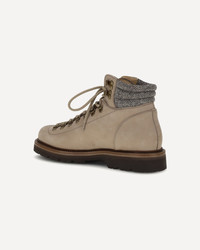 Brunello Cucinelli's Hiking Boots perfectly combine functionality and refined style. The details, inspired by hiking boots - such as metal eyelets and two-tone round laces - emphasize the sporty character of the model. The cotton lace-up closure ensures a secure fit, while the leather lining provides comfort and breathability. The rubber bottom offers durability and grip, enriched by a wool and cashmere insert on the back that adds a touch of warmth and luxury to this ankle boot with an outdoor soul and typical Brunello Cucinelli elegance. DETAILS - Sku: MZUDHNS890_CBW35 - Season: AW25 - Composition: UPPER 100% Calf Leather Bos Taurus SOLE 100% Rubber - MADE IN ITALY