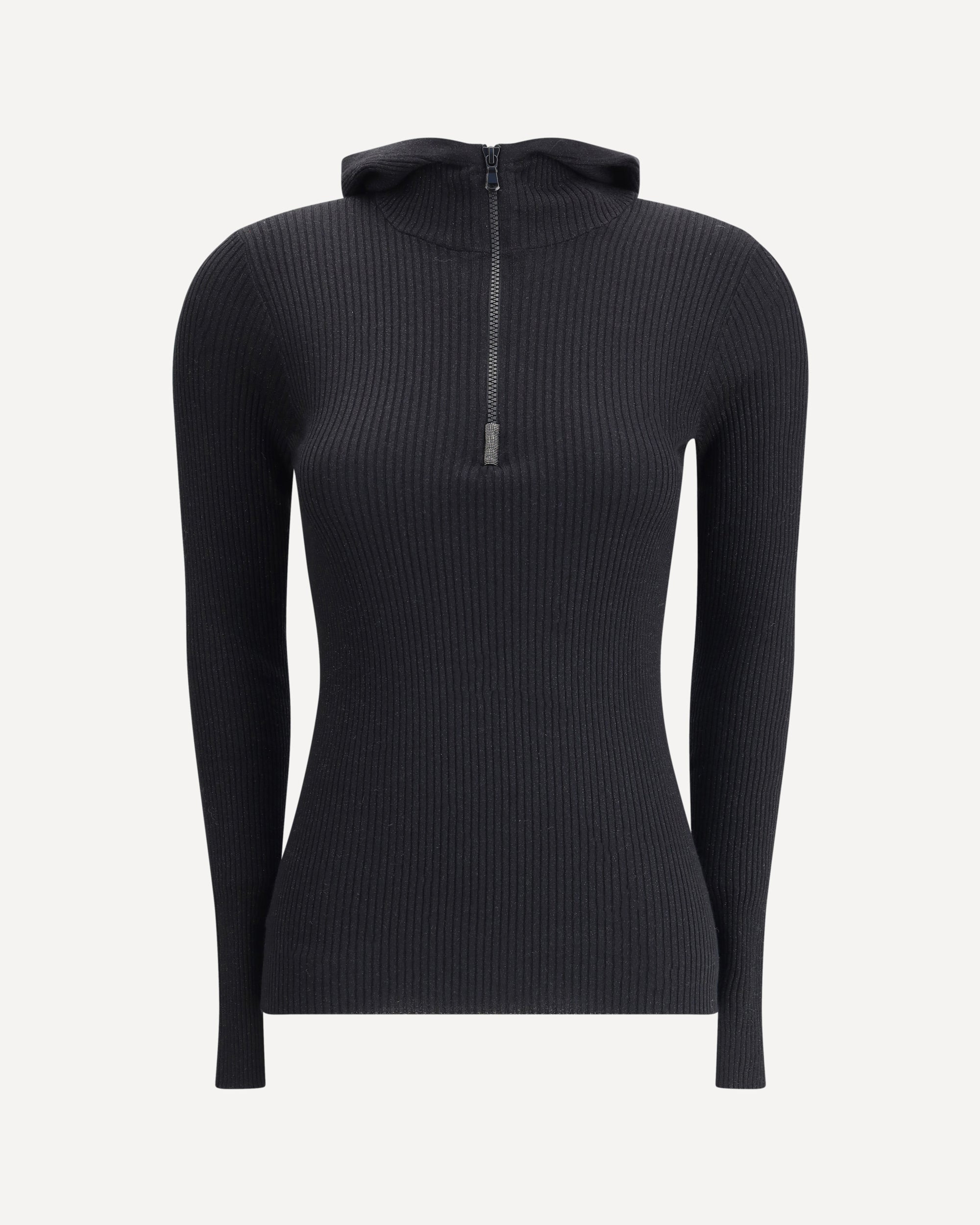 Brunello Cucinelli's Hooded Long Sleeve Sweater is a casual-chic piece with a refined style. Made of ribbed knit, it is embellished with a subtle glitter thread that adds a bright and refined touch. The front zipper and hood complete the design, combining comfort and sophisticated simplicity. DETAILS - Sku: M41844609_C101 - Season: AW25 - Fit: Slim - Composition: GENERAL 51% Kashmir/capra Hircus 22% Silk 20% Polyamide 7% Polyester - MADE IN ITALY
