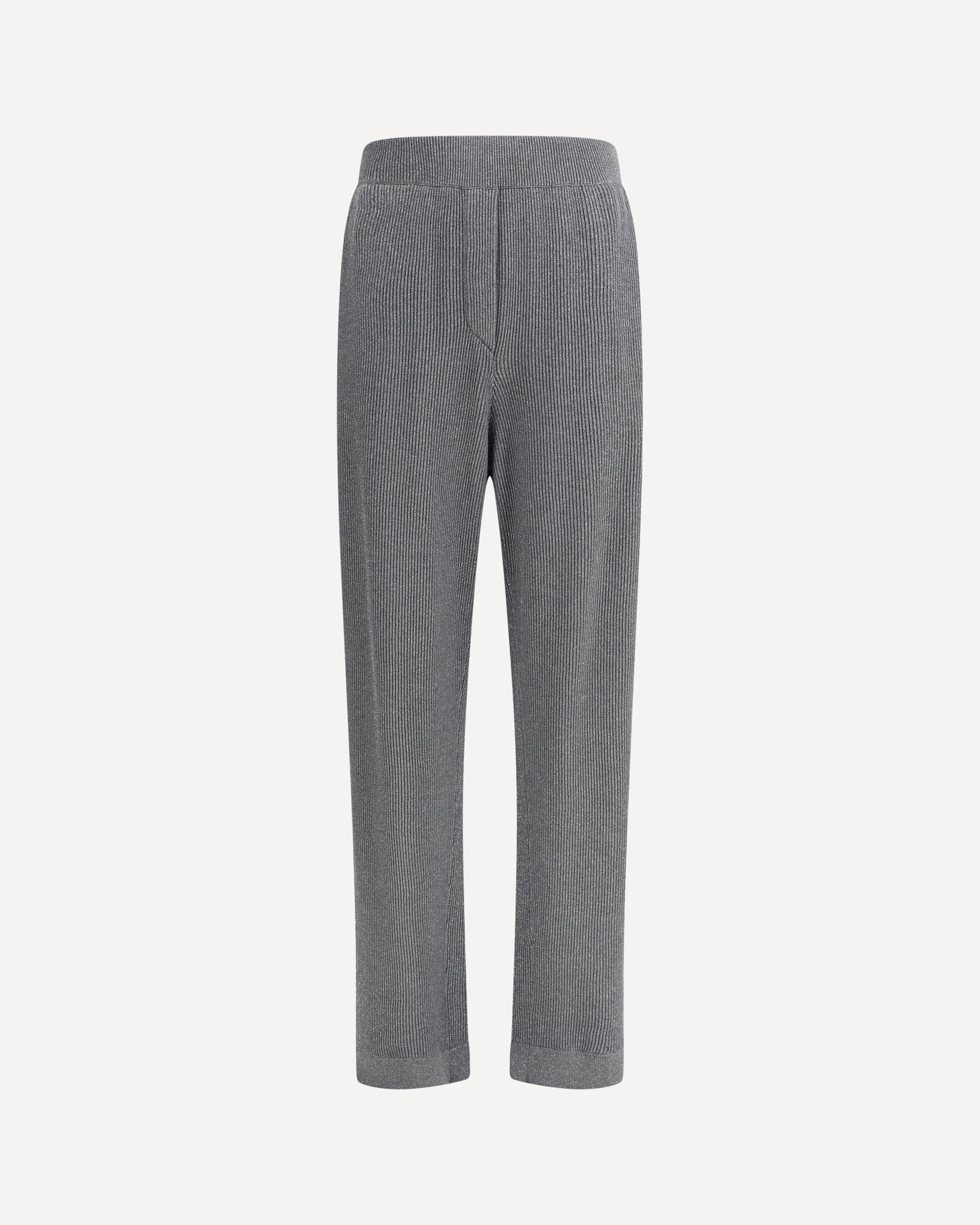 Brunello Cucinelli's cotton Pants feature a ribbed knit design embellished with silver thread, adding a touch of elegance. The elasticized waistband provides comfort, while the two side welt pockets offer practicality. The ribbed design gives a structured and sophisticated look, perfect for both casual and more refined looks. DETAILS - Sku: MAZ260299_CXP07 - Season: AW25 - Fit: Regular - Composition: GENERAL 72% Cotton 22% Viscose 6% Metal Metallic Metallised - MADE IN ITALY