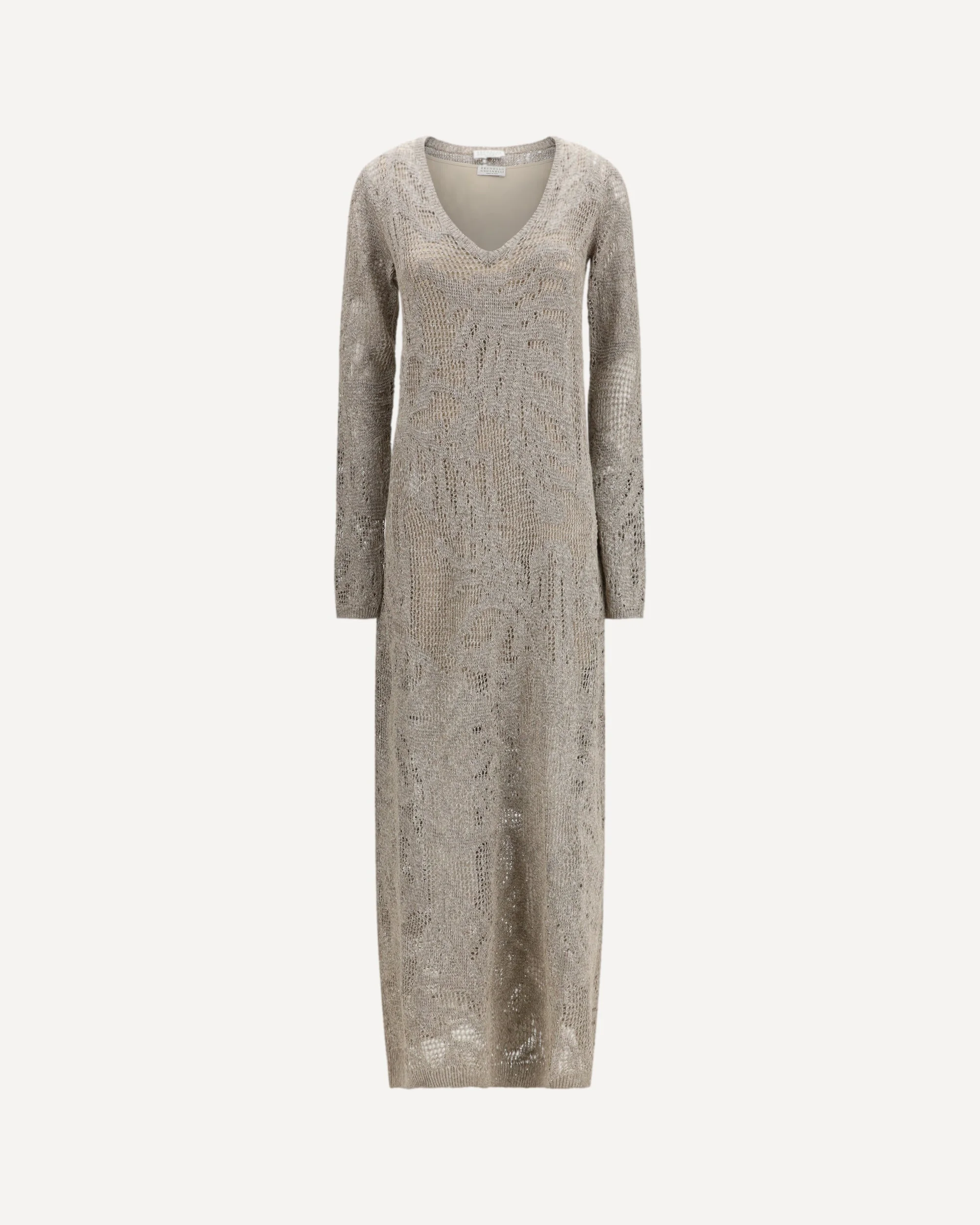 The knit sequin Dress by Brunello Cucinelli embodies luminous elegance with refined lightness. Featuring a V-neckline and long sleeves, it stands out for its textured knit construction and subtly sheer design, adding depth to the silhouette. The metallic finish with sequins provides a delicate shimmer, enhancing the garment’s sophisticated appeal. DETAILS - Sku: MDT771A82_C9089 - Season: SS26 - Fit: Regular - Composition: GENERAL 94% Linen 6% Cotton - MADE IN ITALY