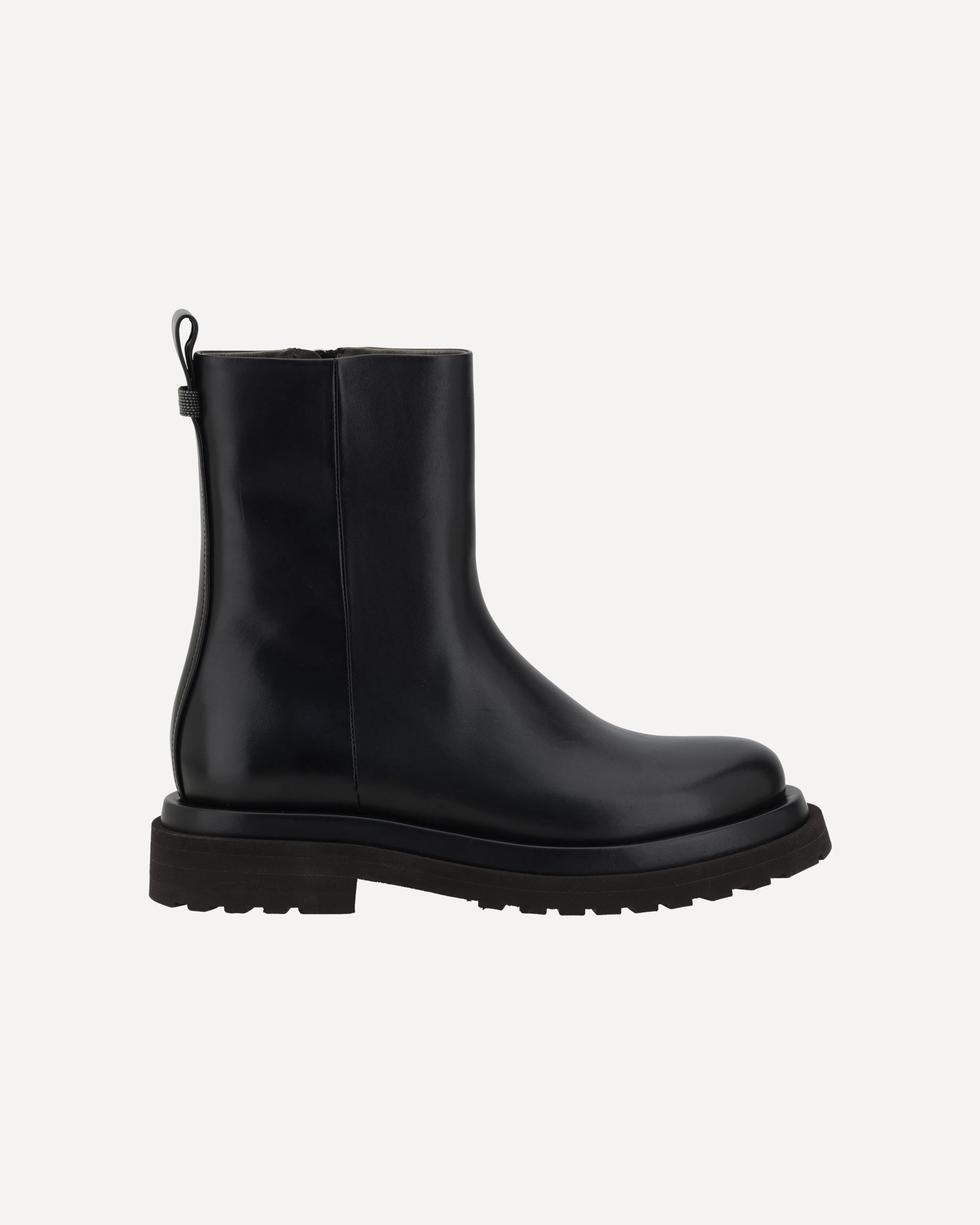 Brunello Cucinelli's Leather Ankle Boots are a stylish and functional item, featuring a round toe that ensures a comfortable fit. The ankle-length design features stretch-fabric side bands that ensure a perfect fit, while the pull-on at the back makes it easy to put on. The polished leather design lends a luxurious touch, while the block heel adds stability and comfort. Perfect for stylishly completing any outfit, these ankle boots are ideal for any occasion. DETAILS - Sku: MZOLG3089_C101 - Season: AW25 - Composition: UPPER 100% Calf Leather Bos Taurus SOLE 100% Rubber - MADE IN ITALY