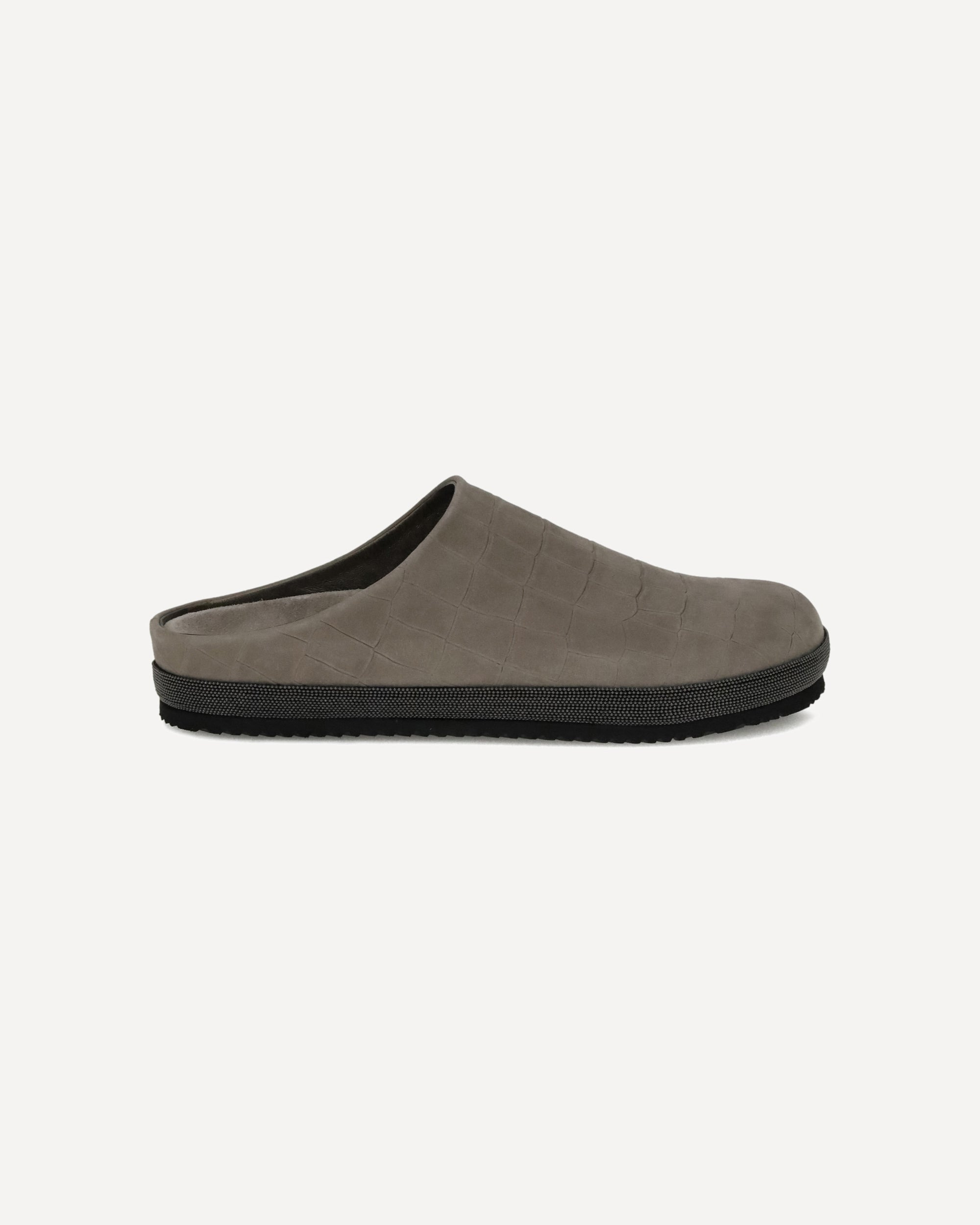 Brunello Cucinelli's leather Sabots express understated elegance and careful craftsmanship. Featuring a refined croc-effect design, they have a rounded toe and a flat sole designed for maximum comfort. The distinctive touch is provided by the inserts of iconic shiny jewels along the profiles, which illuminate the silhouette with understated sophistication. DETAILS - Sku: MZDCG3040P_C3983 - Season: AW25 - Composition: SOLE 100% Rubber UPPER 100% Calf Leather Bos Taurus - MADE IN ITALY