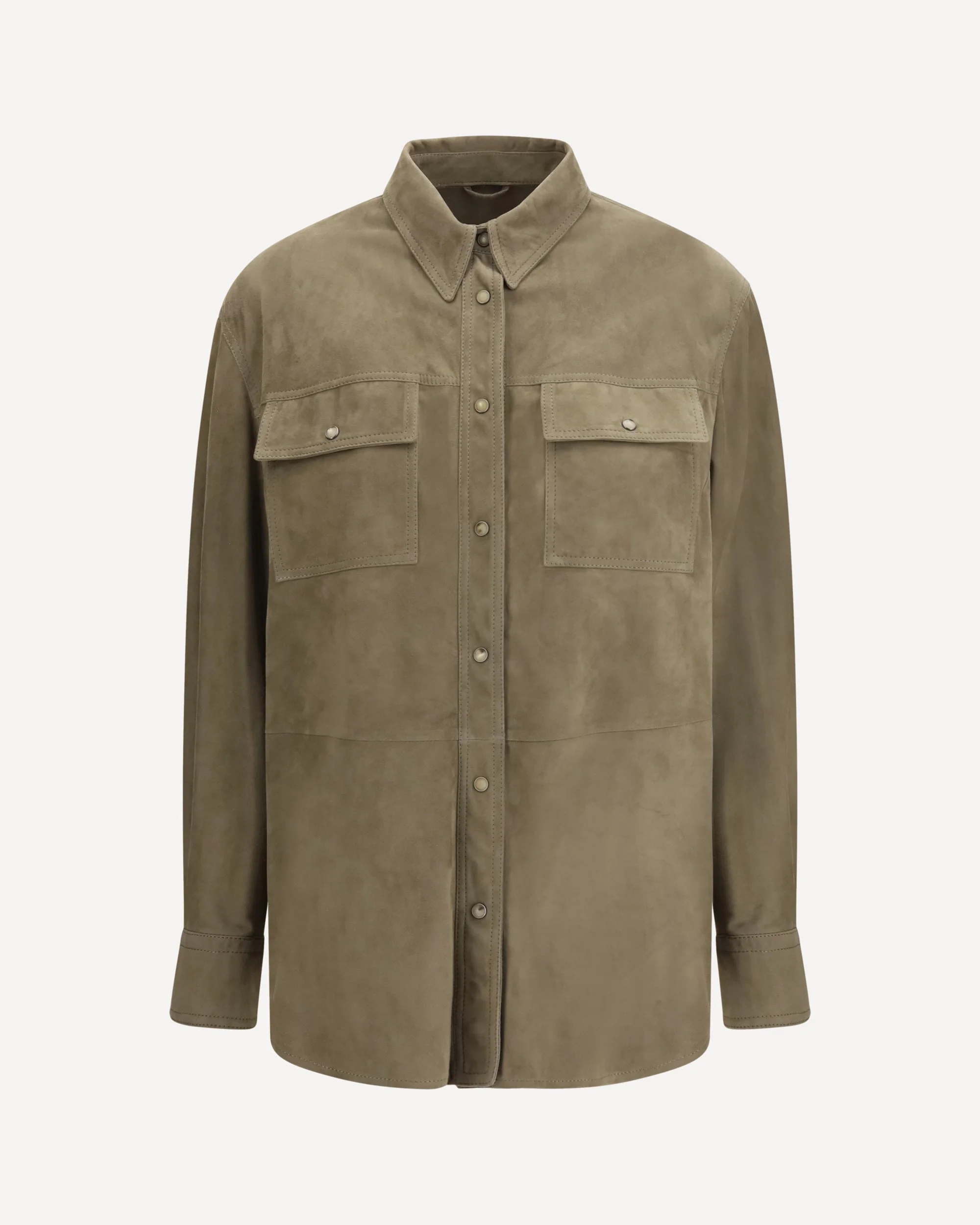 The leather Shirt with chest pockets by Brunello Cucinelli conveys a sophisticated and contemporary attitude. Crafted from supple leather, it features a pointed collar, front button fastening and long sleeves shaping a structured yet fluid silhouette. The applied chest pockets and curved hem complete the design with a refined balance of elegance and utility spirit. DETAILS - Sku: MPCAL7436_C8850 - Season: SS26 - Fit: Regular - Composition: OUTER 100% Calf Suede INNER 74% Acetate 26% Silk - MADE IN ITALY
