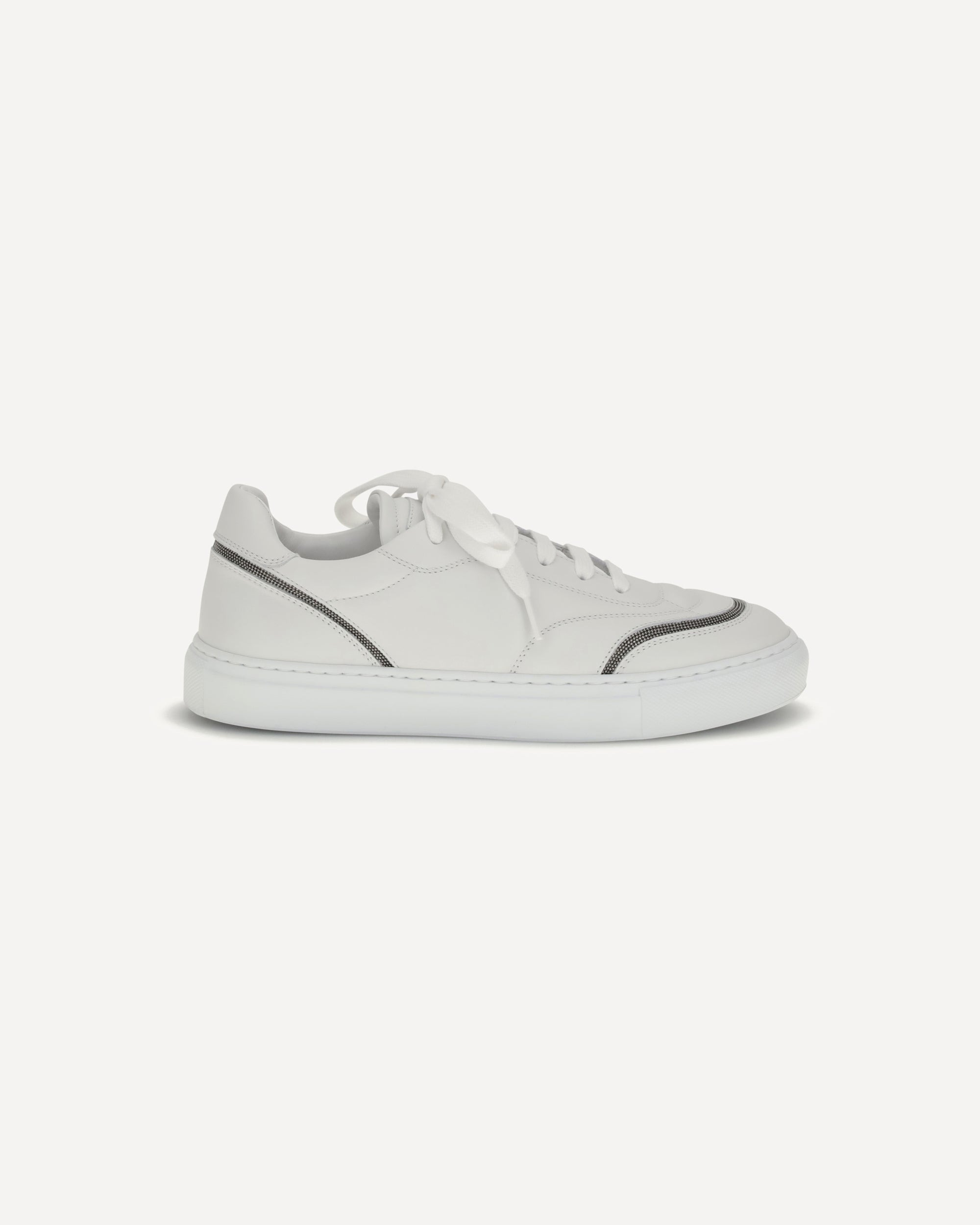 The leather Sneakers with shiny details by Brunello Cucinelli combine understated elegance with a sporty spirit. Crafted from leather with a matching lining, they feature flat cotton laces and a TPU rubber sole for comfort and durability. The rubber tread ensures grip, while the shiny monili decoration adds a distinctive and refined touch, typical of the brand's aesthetic. DETAILS - Sku: MZGSG3077P_C7592 - Season: AW25 - Composition: UPPER 100% Calf Leather Bos Taurus SOLE 100% Rubber - MADE IN ITALY
