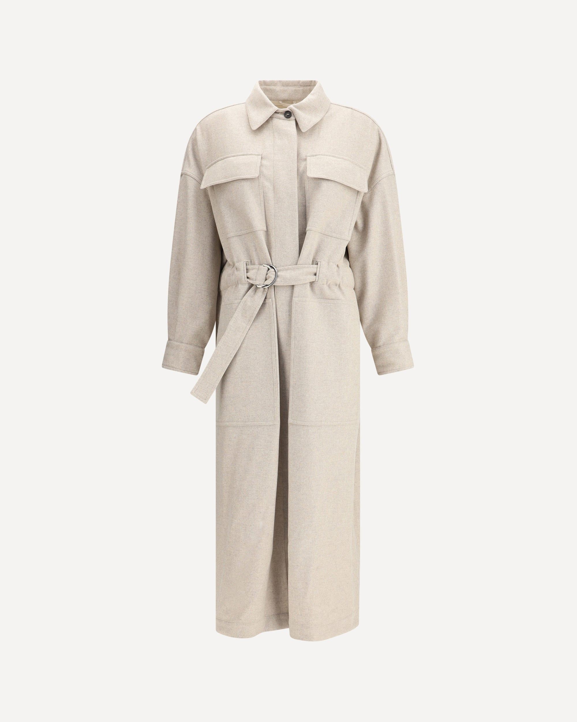 Brunello Cucinelli's Long Coat is a timelessly elegant garment perfect for any occasion. Featuring a classic collar and a front button closure, it has two flap patch pockets on the chest and two side patch pockets, combining practicality and style. The matching, adjustable waistband allows you to define the silhouette, adding a touch of sophisticated personalization to the design. A versatile and refined garment that combines warmth and luxury. DETAILS - Sku: MD5919945P_C108 - Season: AW25 - Fit: Regular - Composition: GENERAL 98% Wool 2% Other Fibres - MADE IN ITALY