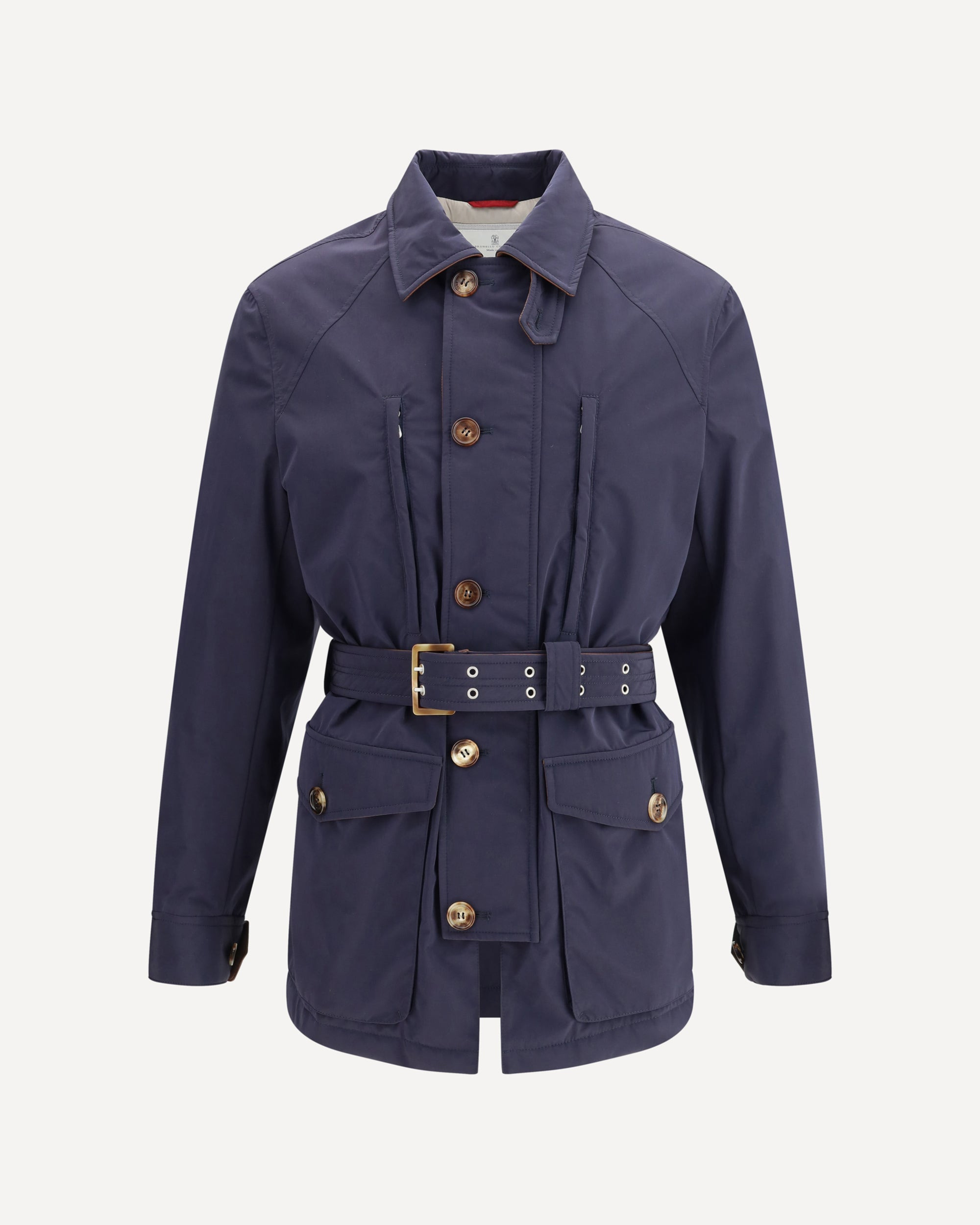 Brunello Cucinelli's saharan Jacket in membraned nylon is a technical and stylish outerwear designed to offer protection and style. Featuring a double zipper and button closure, it has a structured collar that can be held up for added coverage. High zippered pockets and low patch pockets with a flap and button combine functionality and design, while adjustable cuffs and belt loops allow for a customized fit. Fully lined and padded with Thermore®, it is enhanced by practical interior button pockets and a pen pocket. DETAILS - Sku: MM4796560_CUA35 - Season: AW25 - Fit: Regular - Composition: GENERAL 70% Polyester 30% Polyamide - MADE IN ITALY