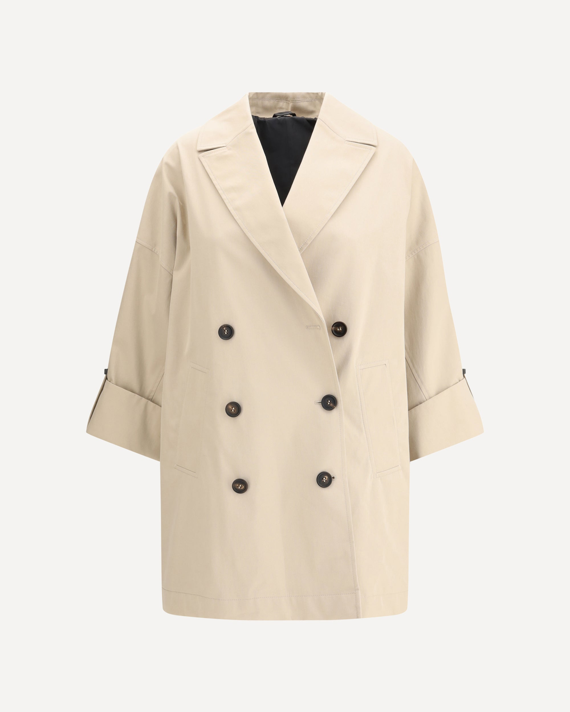 Brunello Cucinelli's midi Trench Coat is an iconic garment reinterpreted with contemporary elegance. Featuring a wide lapel and double-breasted closure, it has two side welt pockets and wide sleeves embellished with distinctive shiny jewel detail for a sophisticated and feminine touch. DETAILS - Sku: MM5397740P_C6697 - Season: AW25 - Fit: Regular - Composition: GENERAL 45% Cotton 55% Polyester - MADE IN ITALY