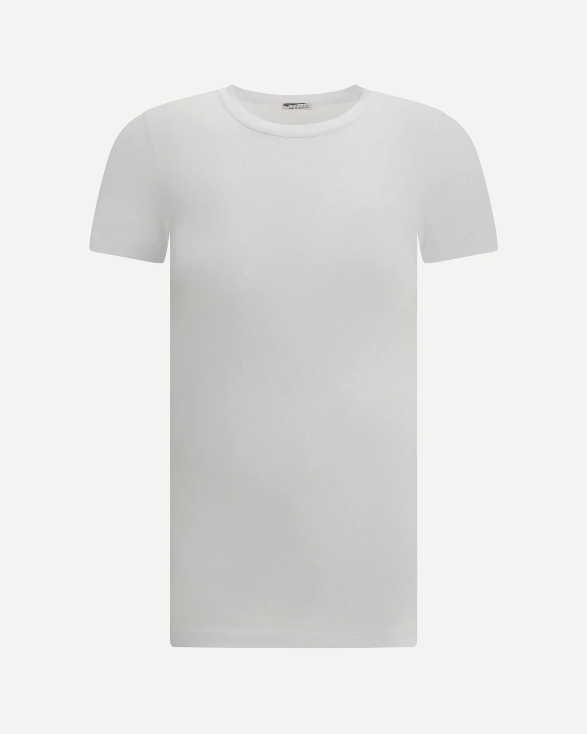 The Brunello Cucinelli cotton T-Shirt is a garment with a simple and sophisticated design, with a ribbed crew neck that adds a touch of discreet elegance. The monochrome pattern gives a clean and versatile look, perfect for casual and refined looks. The regular fit guarantees comfort and a balanced silhouette, making this T-shirt an essential element for the everyday wardrobe. DETAILS sku M0T18B0170_C159 composition: COTTON 100% color group: WHITE gender: WOMAN season: SS25 size chart: STANDARD category name: T-SHIRTS