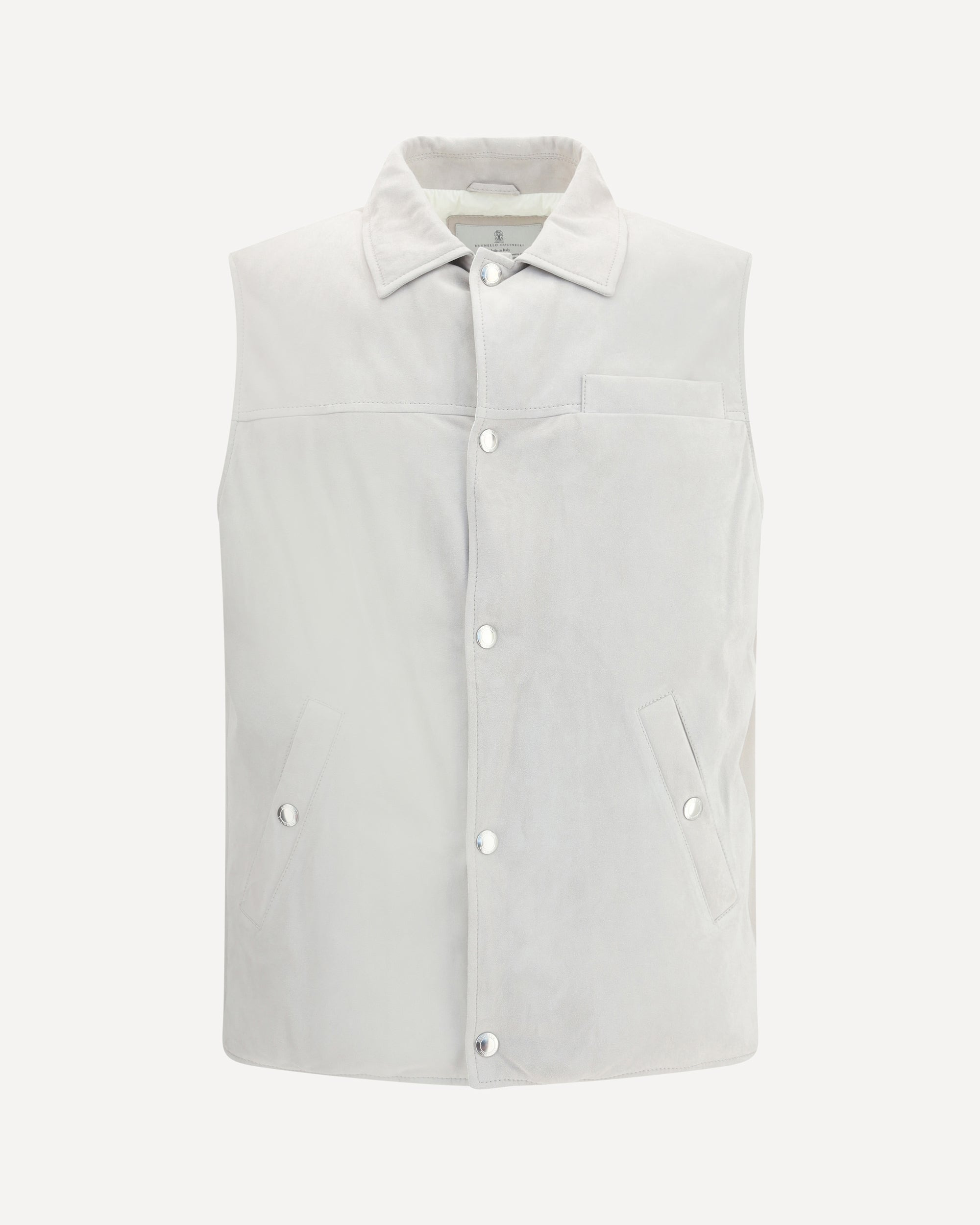Brunello Cucinelli's padded leather Vest is a sophisticated garment that combines elegance and functionality. Made of soft leather, it features a snap-button closure and a shirt-style collar that enhances the tailored design. The breast pocket and welt pockets with snap button add practicality without sacrificing style. Inside, two button-fastening pockets and a pen pocket complete the structure. Fine goose down filling ensures warmth and comfort, making the vest ideal for colder seasons. DETAILS - Sku: MPCLF2047_C4245 - Season: AW25 - Fit: Regular - Composition: OUTER 100% Leather INNER 100% Goose Down - MADE IN ITALY