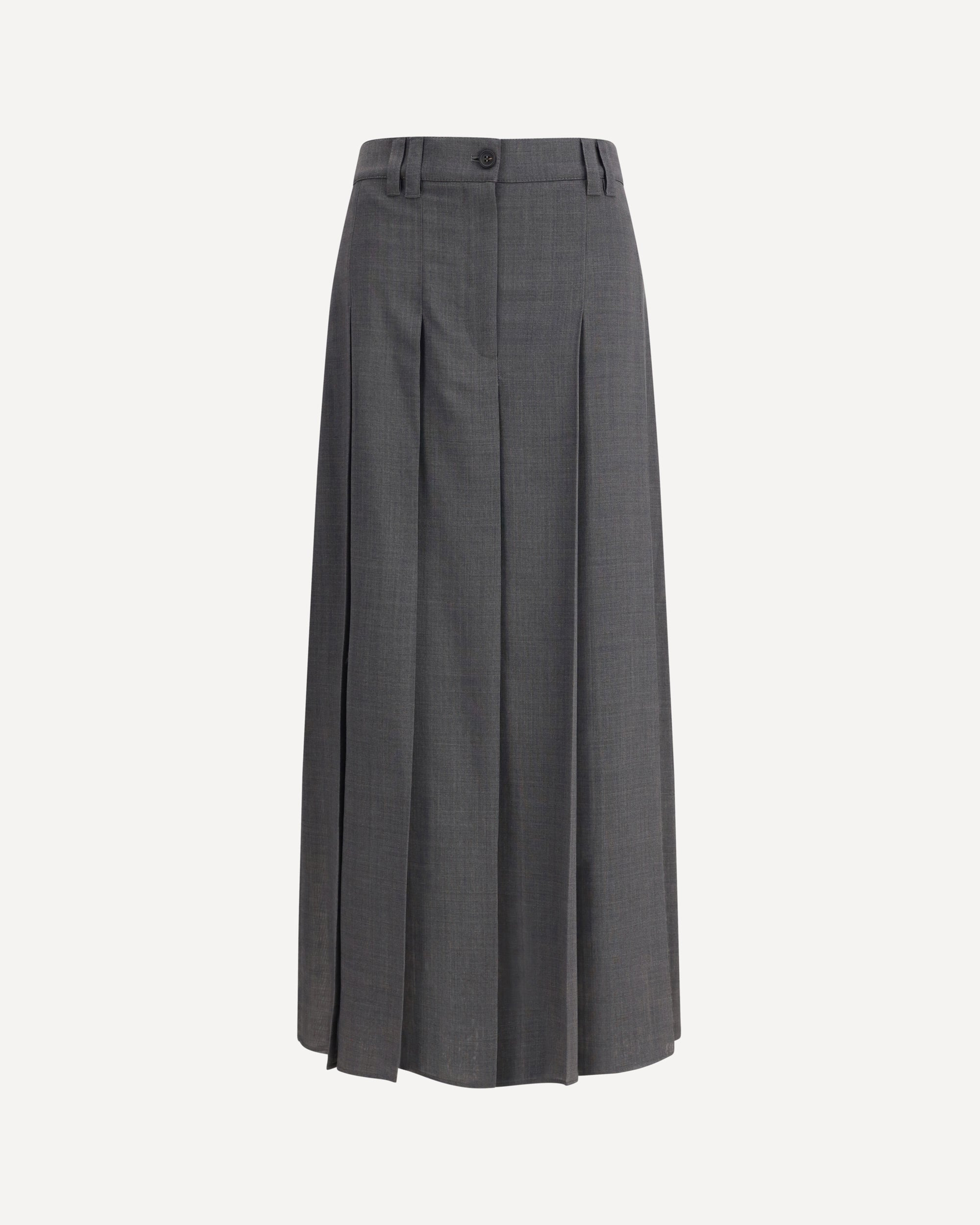 The pleated long Skirt in virgin wool techno gauze by Brunello Cucinelli stands out for its fine materials and refined details. The lightweight fabric enhances the wide pleating that runs along the entire length of the garment, creating a sense of fluidity and movement. The zip and tab closure, combined with the back welt pocket, evoke masculine tailoring codes, while the hem with slits emphasizes the feminine silhouette. Completing the design, the signature monile detail adds a luminous accent, a distinctive mark of Brunello Cucinelli’s timeless elegance. DETAILS - Sku: MP087G3864_C2164 - Season: AW25 - Fit: Regular - Composition: GENERAL 55% Polyester 45% Fleece Wool - MADE IN ITALY