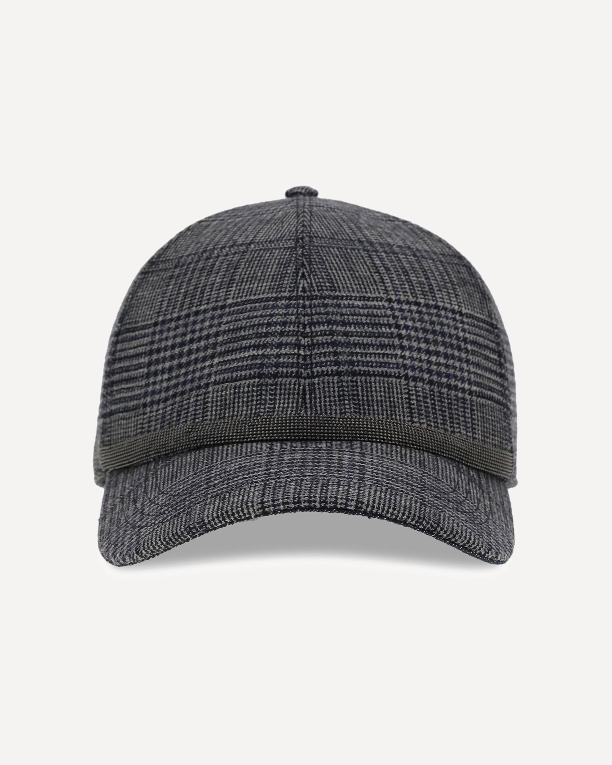 The Prince of Wales Fabric Baseball Hat with Shiny Band by Brunello Cucinelli reinterprets a sporty classic with a sophisticated twist. The reinforced visor provides structure and protection, while the adjustable leather strap with buckle ensures a customized fit. The interior, lined in crepe, offers comfort and lightness, complemented by the nickel-free monile decoration, a precious and distinctive detail of the house's style. DETAILS - Sku: MCAP90069_C4227 - Season: AW25 - Composition: GENERAL 100% Fleece Wool - MADE IN ITALY