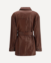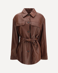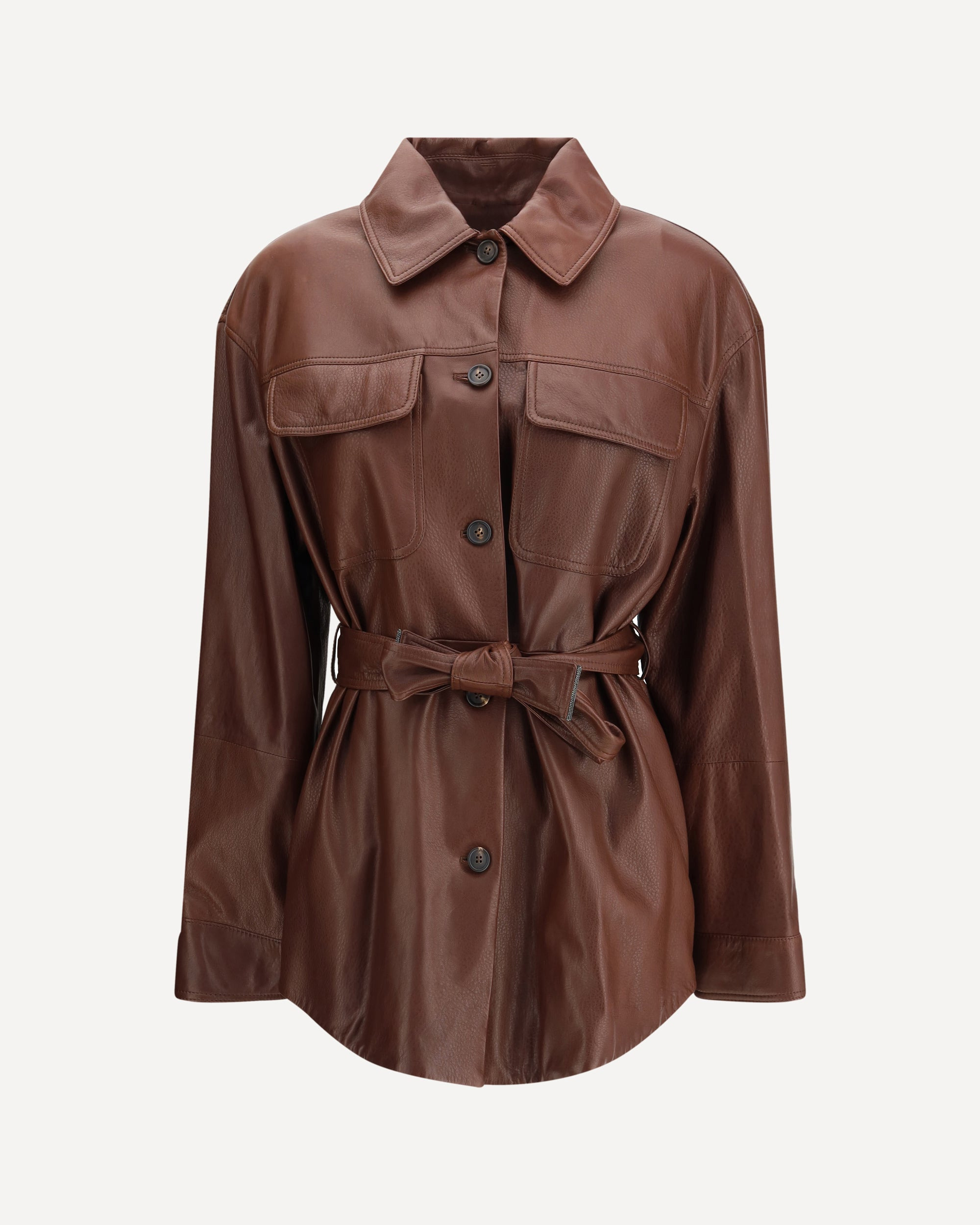 Brunello Cucinelli's Saharan Leather Jacket is a versatile and refined design that blends classic charm with a modern touch. The classic collar and front button closure define its elegant silhouette, while the two front patch pockets and side welt pockets offer practicality without sacrificing style. The knotted sash at the waist adds a feminine and sophisticated detail, allowing you to customize the fit for a defined silhouette. DETAILS - Sku: MPMUL7453P_C4193 - Season: AW25 - Fit: Regular - Composition: GENERAL 100% Calf Leather Bos Taurus - MADE IN ITALY