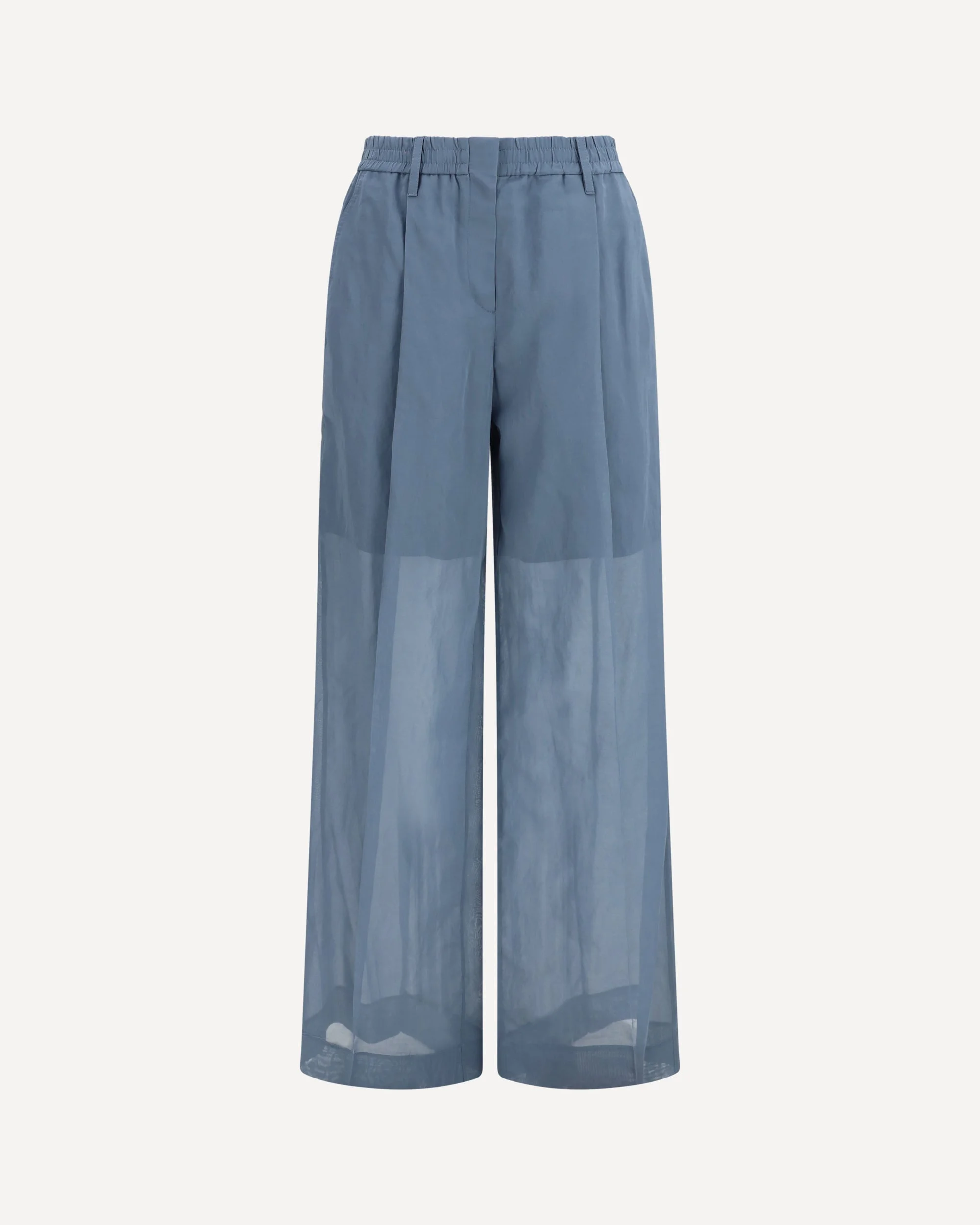 The Sartorial Track Pants by Brunello Cucinelli are made of cotton organza, characterized by a fluid line with front pleats that define the structure of the leg. They feature a zip closure with metal hook and counter button, an elasticated waistband, front American pockets, and rear welt pockets. The model is half-lined in silk-blend crepe and finished with Brunello Cucinelli’s signature nickel-free monili decoration, a distinctive detail of the house. Elegant Pants, suitable for formal, business, and special occasion outfits. DETAILS - Sku: M0F91P9174_C9704 - Season: SS26 - Fit: Regular - Composition: GENERAL 100% Cotton - MADE IN ITALY