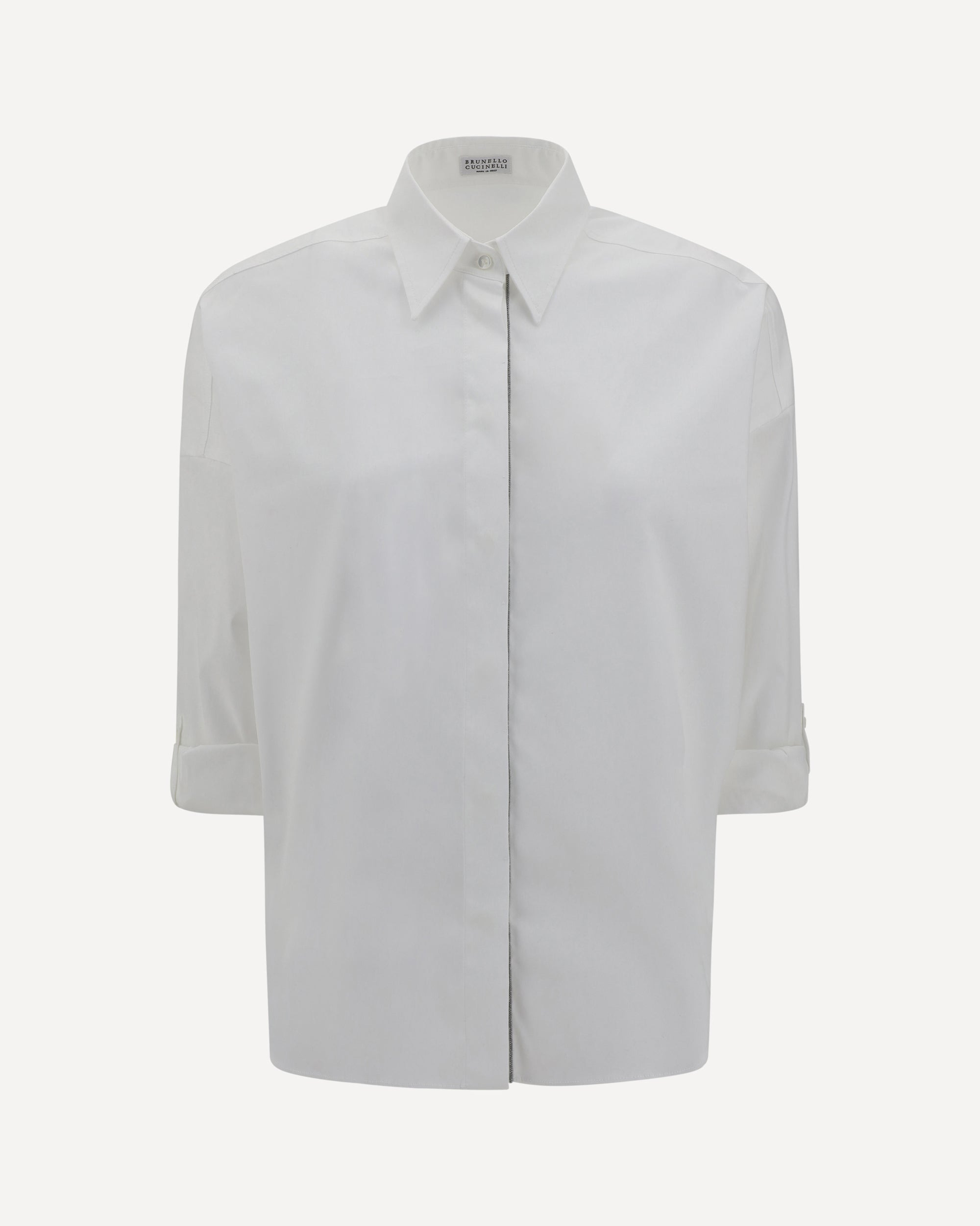 Brunello Cucinelli's shiny cotton monili Shirt is an elegant and sophisticated piece perfect for a refined look. Featuring a classic collar and a hidden button front closure, it offers a clean, minimalist design. Insets with the brand's iconic jewelry add a touch of understated luxury. Adjustable button cuffs allow you to adjust the fit, while the regular silhouette ensures comfort and versatility. This shirt is a true must-have in the wardrobe of those seeking elegance and quality. DETAILS sku M0091MA636_C159 composition: COTTON 100% color group: WHITE gender: WOMAN season: SS25 size chart: STANDARD category name: SHIRTS