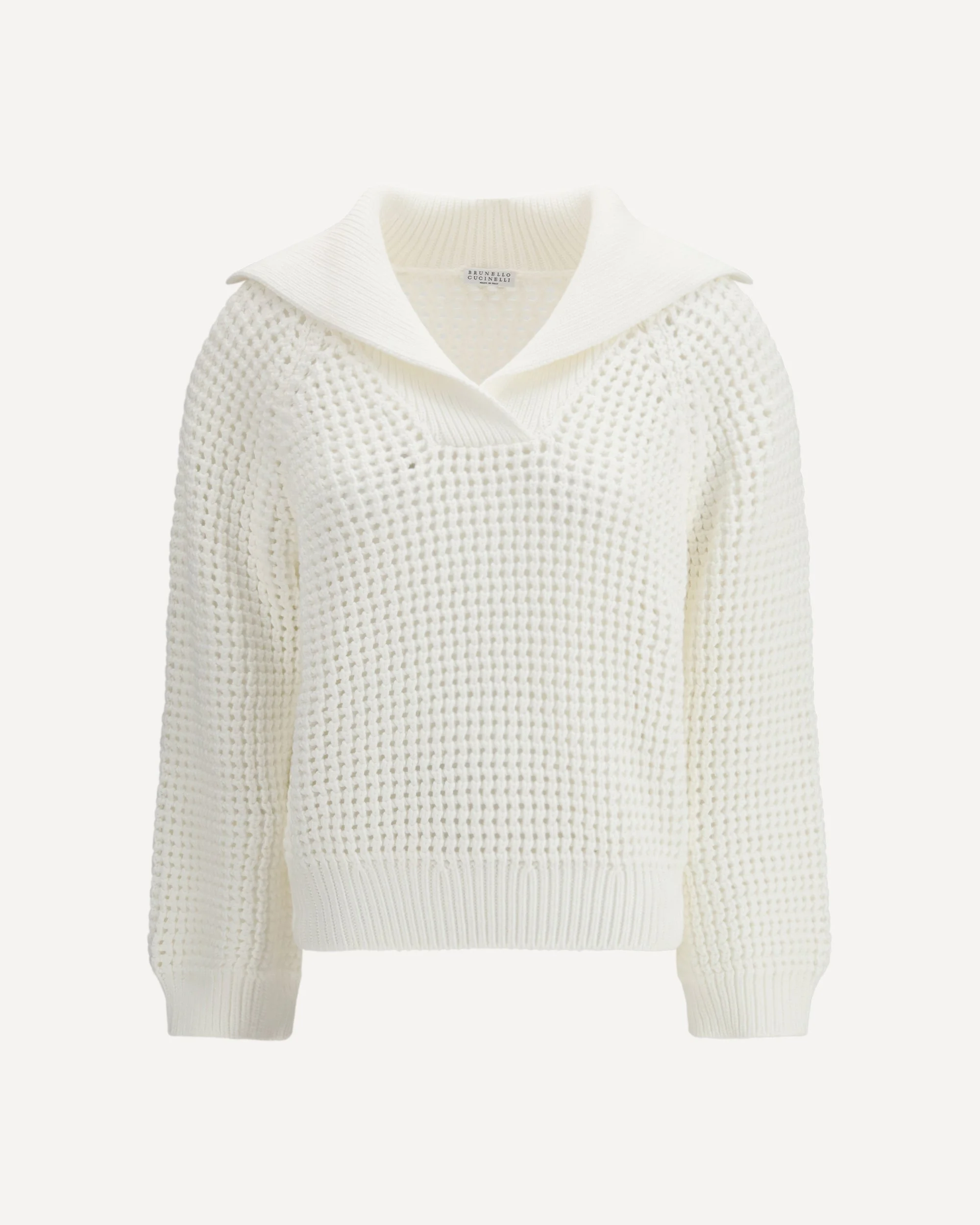 The Shirt collar Jumper by Brunello Cucinelli reimagines knitwear with a refined, modern sensibility. Its thick, textured openwork construction adds depth while maintaining an airy feel, and the V-neckline enhanced by a shirt-style collar introduces a sophisticated, tailored contrast. Long sleeves finished with structured cuffs complete a balanced, versatile silhouette—an elevated piece that effortlessly enriches both casual and polished looks. DETAILS - Sku: M89302602_C2723 - Season: SS26 - Fit: Regular - Composition: GENERAL 76% Cotton 24% Polyamide - MADE IN ITALY