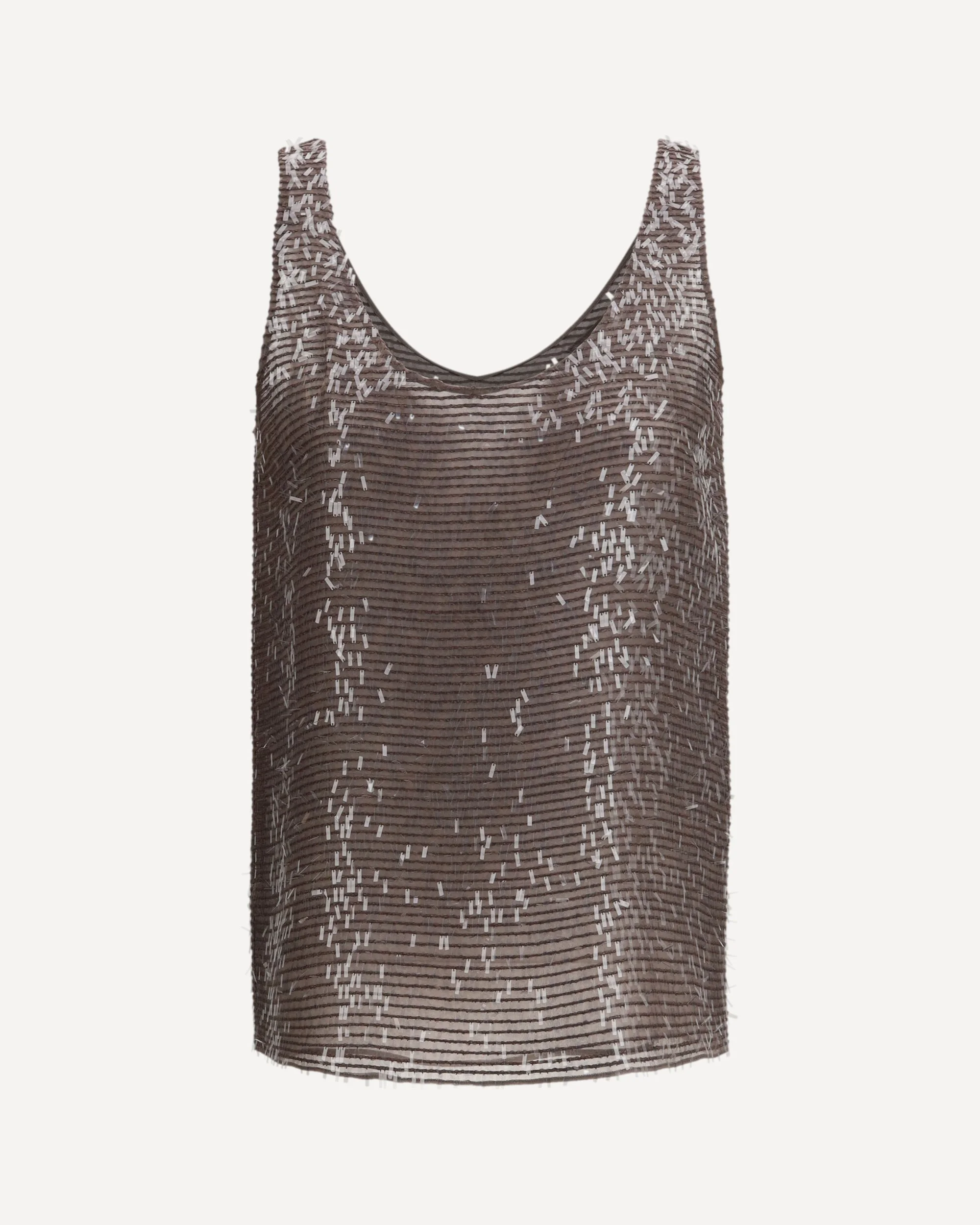 The sleeveless scoop-neck Top by Brunello Cucinelli embodies a luminous and delicate elegance. Defined by a wide neckline, it features sequin embellishments that add a refined, shimmering touch. The sheer overlay lends lightness and depth to the design, creating a sophisticated and feminine effect, perfect for elegant, contemporary looks. DETAILS - Sku: MF940HW310_C8589 - Season: SS26 - Fit: Regular - Composition: GENERAL 100% Silk - MADE IN ITALY
