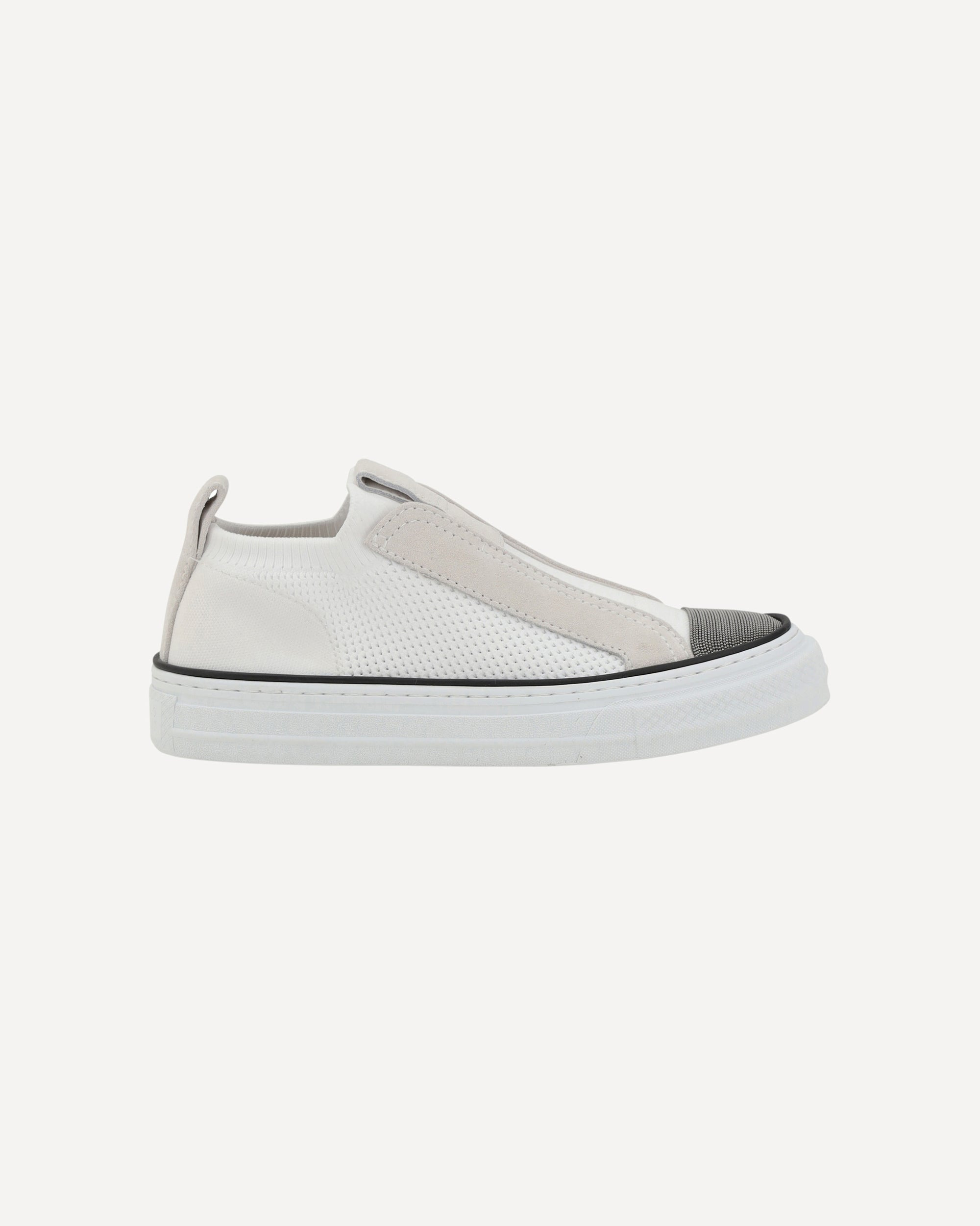 Brunello Cucinelli's Sneakers are a perfect blend of elegance and comfort. The round toe is embellished with iconic contrasting jewels, adding a distinctive touch. The suede details and stretch perforated mesh design offer a modern, breathable look. The flat sole is embellished with the brand's monogram on the heel, while the branded insole lends an additional luxury accent. An ideal pair of sneakers for a casual-chic look, perfect for those seeking style and comfort. DETAILS sku MZ49G2940_C001 composition: POLYAMIDE 100% RUBBER 100% color group: WHITE gender: WOMAN season: SS25 size chart: SHOES IT category name: SNEAKERS