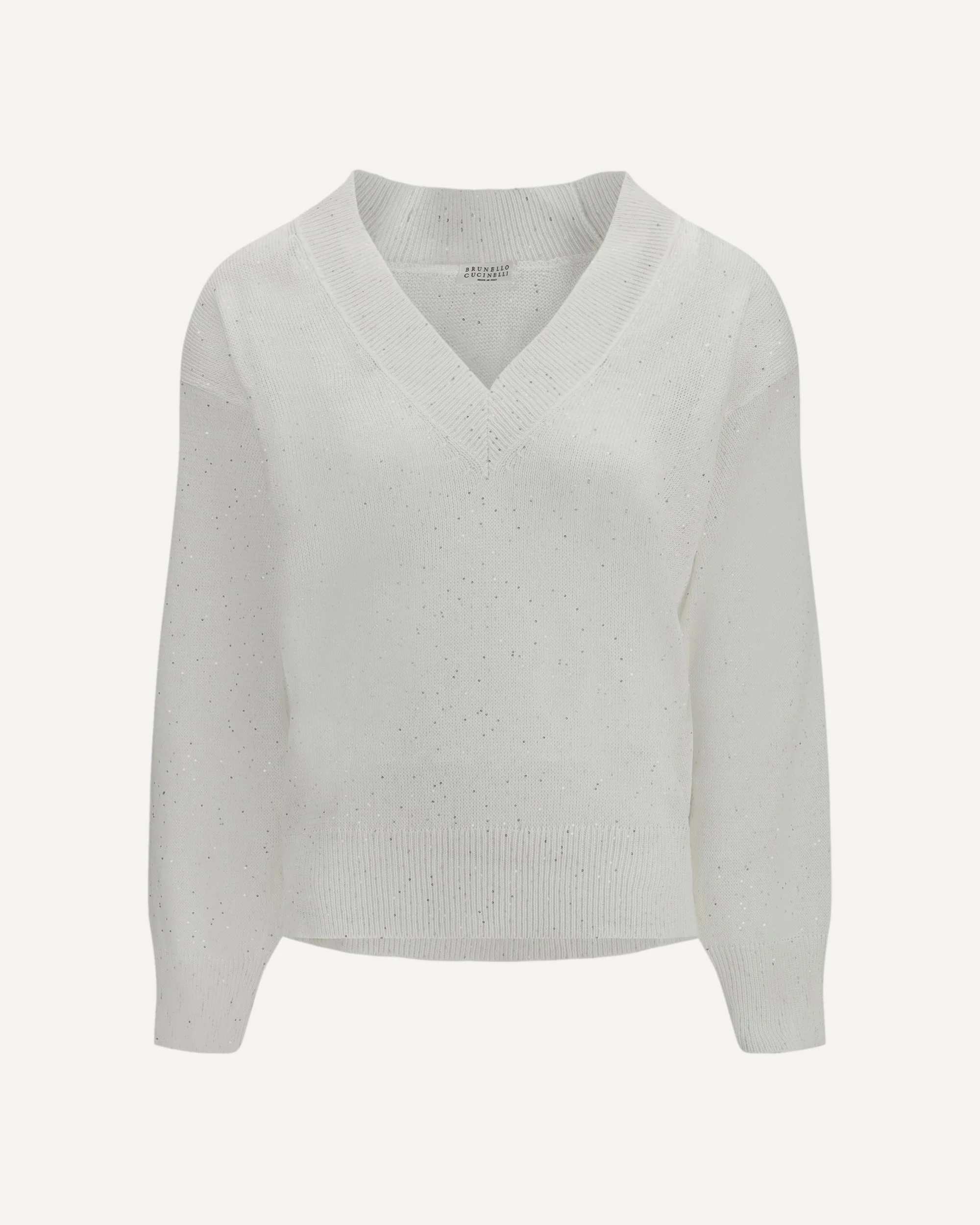 The Sparkling linen Sweater by Brunello Cucinelli embodies a relaxed, natural elegance through its English rib knit. Designed with a V-neckline, dropped shoulders, and raw-effect cuffs and hem, the piece conveys a contemporary, artisanal character true to the House’s refined aesthetic. DETAILS - Sku: MDT746412_C159 - Season: SS26 - Fit: Oversize - Composition: GENERAL 45% Linen 37% Polyester 10% Other Fibres 8% Polyamide - MADE IN ITALY