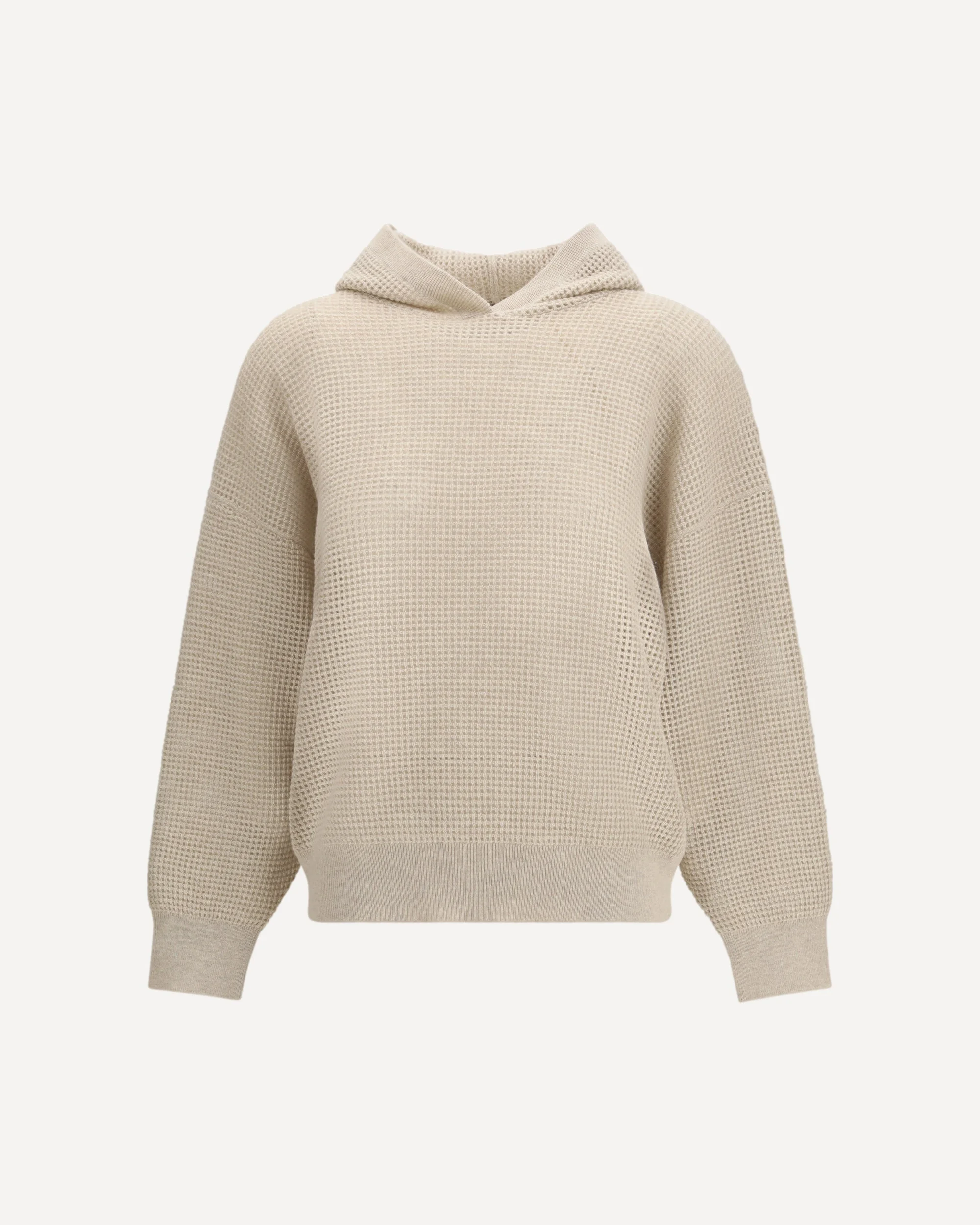 The Sparkling Net cotton hooded Sweatshirt by Brunello Cucinelli reimagines casualwear through a refined and luminous lens. Crafted from soft cotton knit, the surface is subtly infused with fine lame threads that catch the light, imparting a delicate, feminine glow. The hood and low vertical pockets, free from zips or fastenings, emphasize a relaxed, sporty attitude, elevated by the brand’s signature craftsmanship. Slightly dropped shoulders enhance comfort and ease, while ribbed cuffs and hem softly define the silhouette. An understated yet precious sweatshirt, designed to bring quiet elegance to everyday dressing. DETAILS - Sku: M12205109_CFT47 - Season: SS26 - Fit: Regular - Composition: GENERAL 100% Kashmir/capra Hircus - MADE IN ITALY