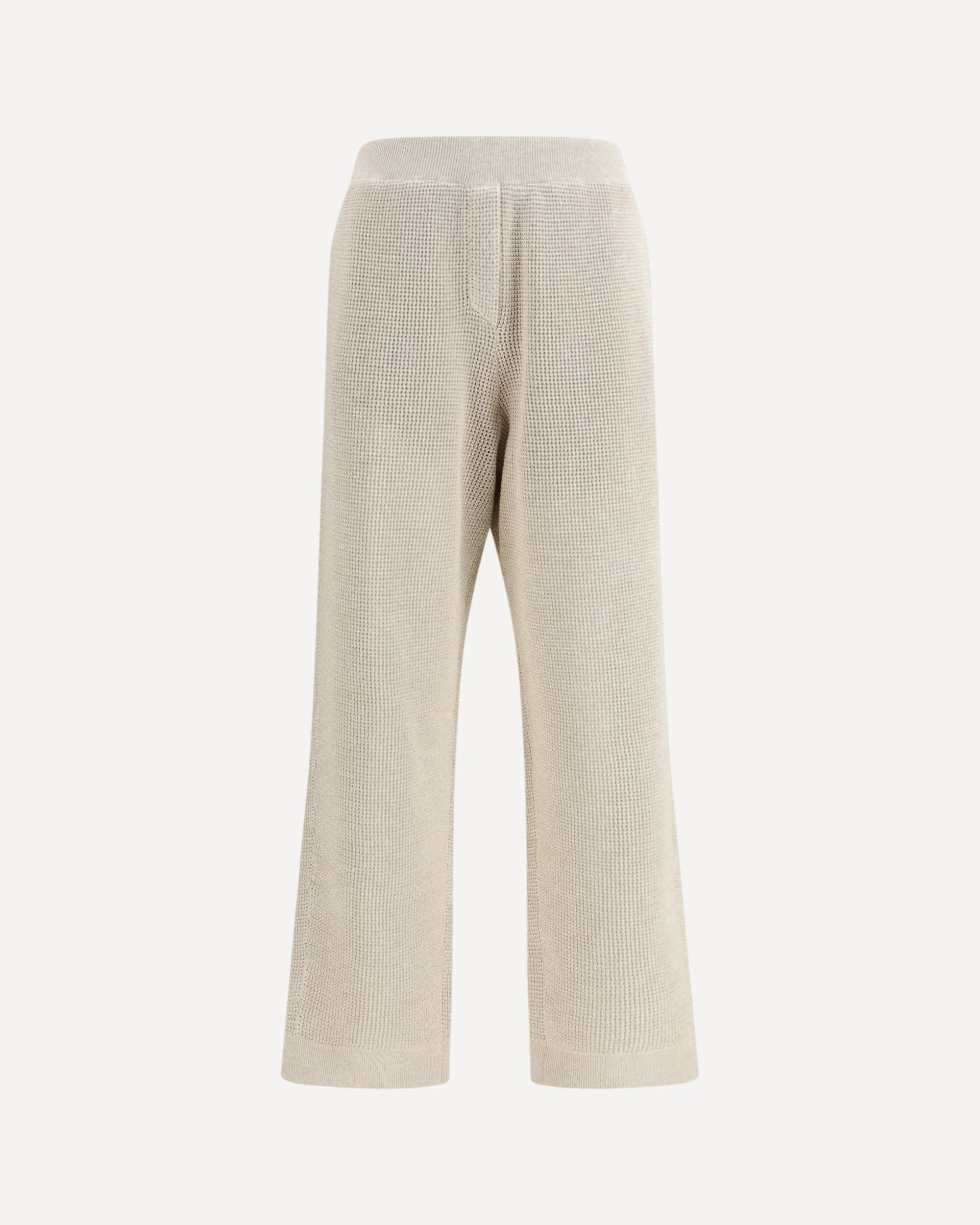The straight-leg Trousers by Brunello Cucinelli convey a refined sense of lightness through the perforated fabric construction enhanced by subtle lurex accents. The elasticated waistband ensures effortless comfort, while the clean silhouette balances relaxed elegance with material sophistication. DETAILS - Sku: MST263399_CY948 - Season: SS26 - Fit: Regular - Composition: GENERAL 79% Cotton 16% Viscose 5% Polyester - MADE IN ITALY