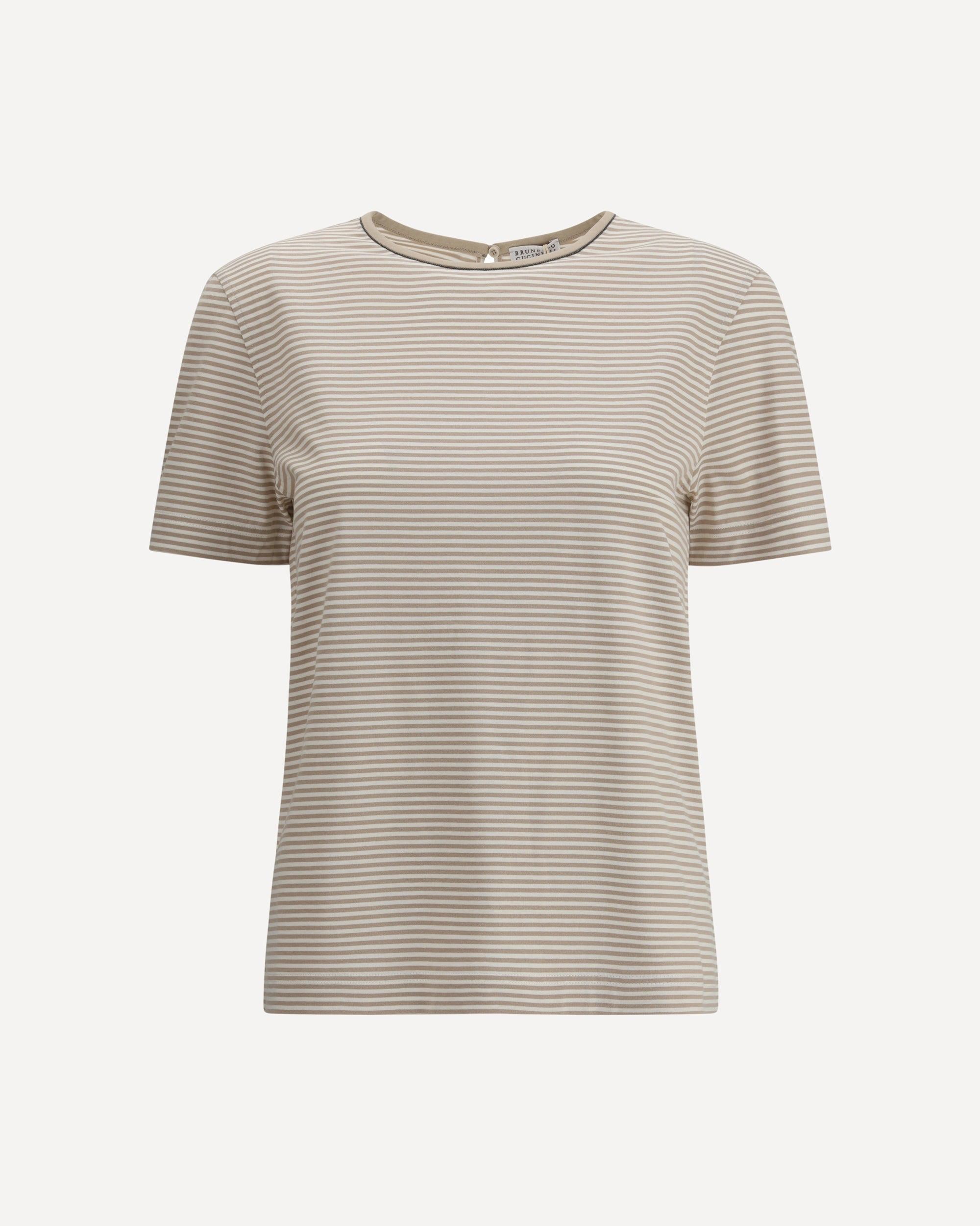 Brunello Cucinelli's striped jersey T-Shirt is an essential and refined garment enhanced by thoughtful details. Featuring a crew neck, regular shoulders and sleeves, it has a buttoned drop opening at the back of the neck, which adds a delicate and feminine touch to the clean design. DETAILS - Sku: MP928EO500_C7015 - Season: AW25 - Fit: Regular - Composition: GENERAL 100% Cotton - MADE IN ITALY