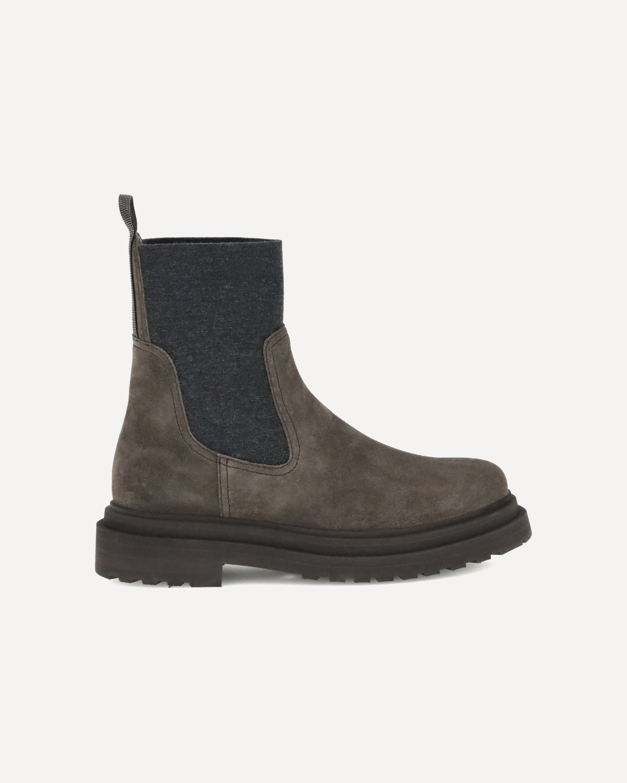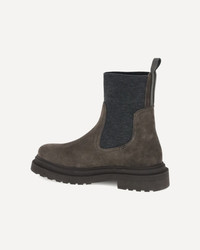 Brunello Cucinelli's suede Ankle Boots combine sophistication and functionality. Featuring a round toe, they feature an elastic gyro-ankle detail that ensures a comfortable and secure fit. The pull-on with the brand's iconic monile further facilitates the fit, while the slip-on style offers everyday practicality. The lugged sole adds a touch of character, making these ankle boots a must-have for a casual, sophisticated look. DETAILS - Sku: MZSFG3034P_C7284 - Season: AW25 - Composition: UPPER 100% Calf Leather Bos Taurus SOLE 100% Rubber - MADE IN ITALY
