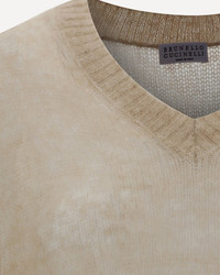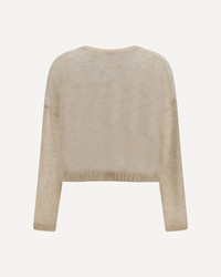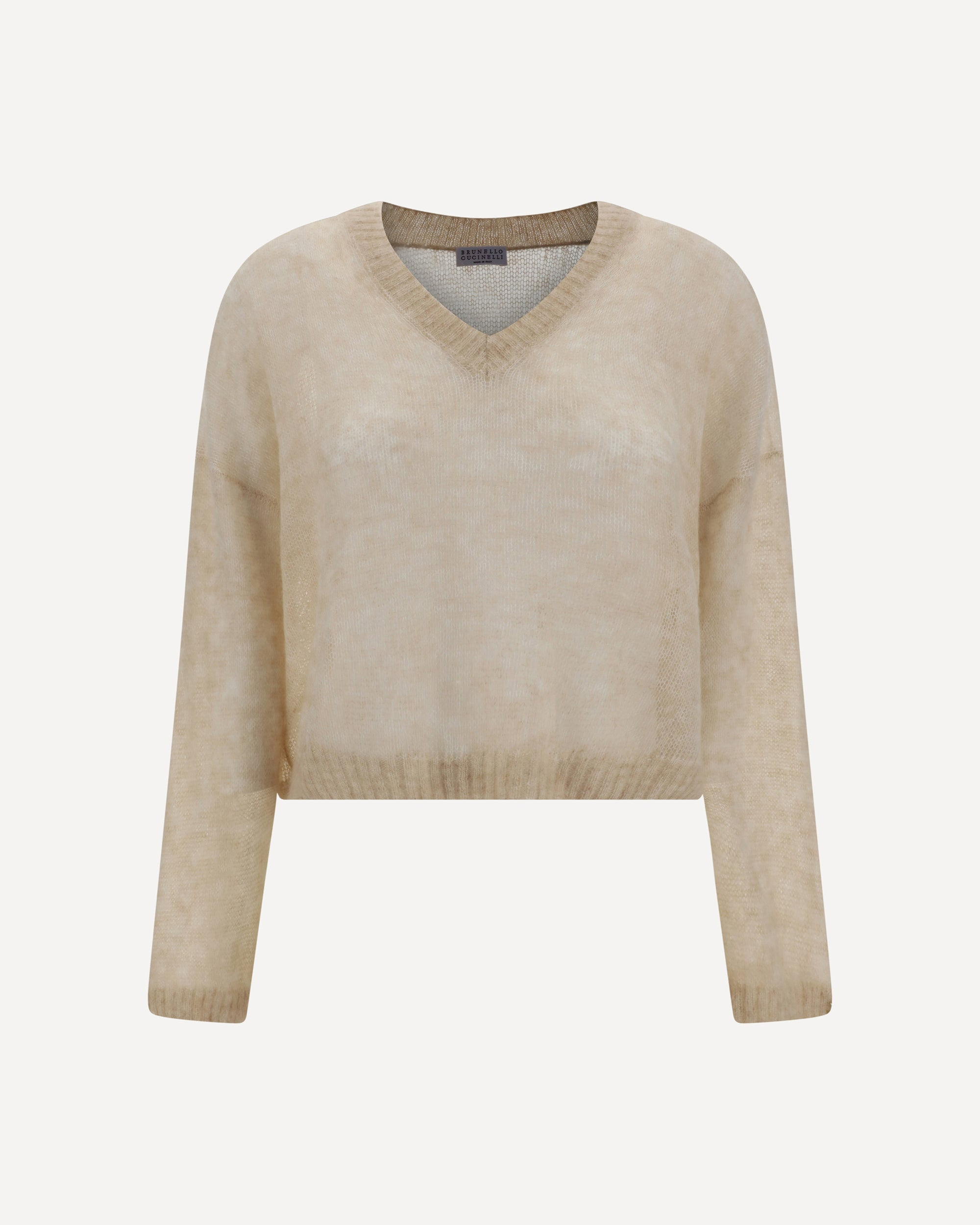 The mohair wool Sweater by Brunello Cucinelli is an elegant and sophisticated piece, characterized by a V-neck on the front that enhances its refined design. The ribbed cuffs and hem add structure to the sweater, while the semi-sheer design gives a touch of lightness and modernity. The monochrome pattern makes it versatile and easy to match, while the regular fit guarantees comfort and a relaxed silhouette. DETAILS sku M2I776822_C3590 composition: MOHAIR 50% WOOL 14% POLYAMIDE 36% color group: BEIGE gender: WOMAN season: SS25 size chart: STANDARD category name: KNITWEAR