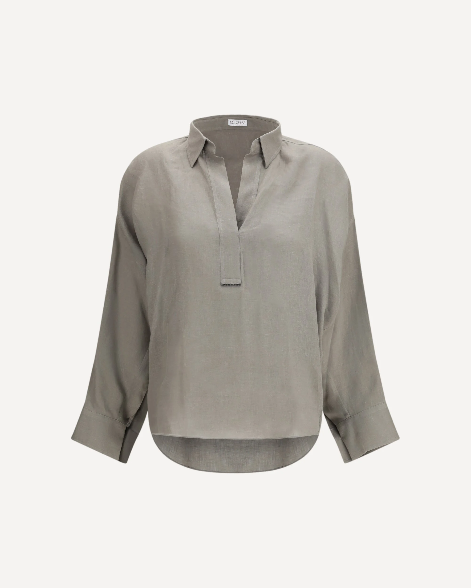 The Blouse by Brunello Cucinelli conveys understated elegance through a light and refined construction. Designed with a V-neckline that enhances the line of the piece, it features long linen sleeves that bring fluidity and comfort. The clean and balanced silhouette results in a contemporary design with a subtle and sophisticated attitude. DETAILS - Sku: MA698MQ705_C1063 - Season: SS26 - Fit: Regular - Composition: GENERAL 100% Linen - MADE IN ITALY