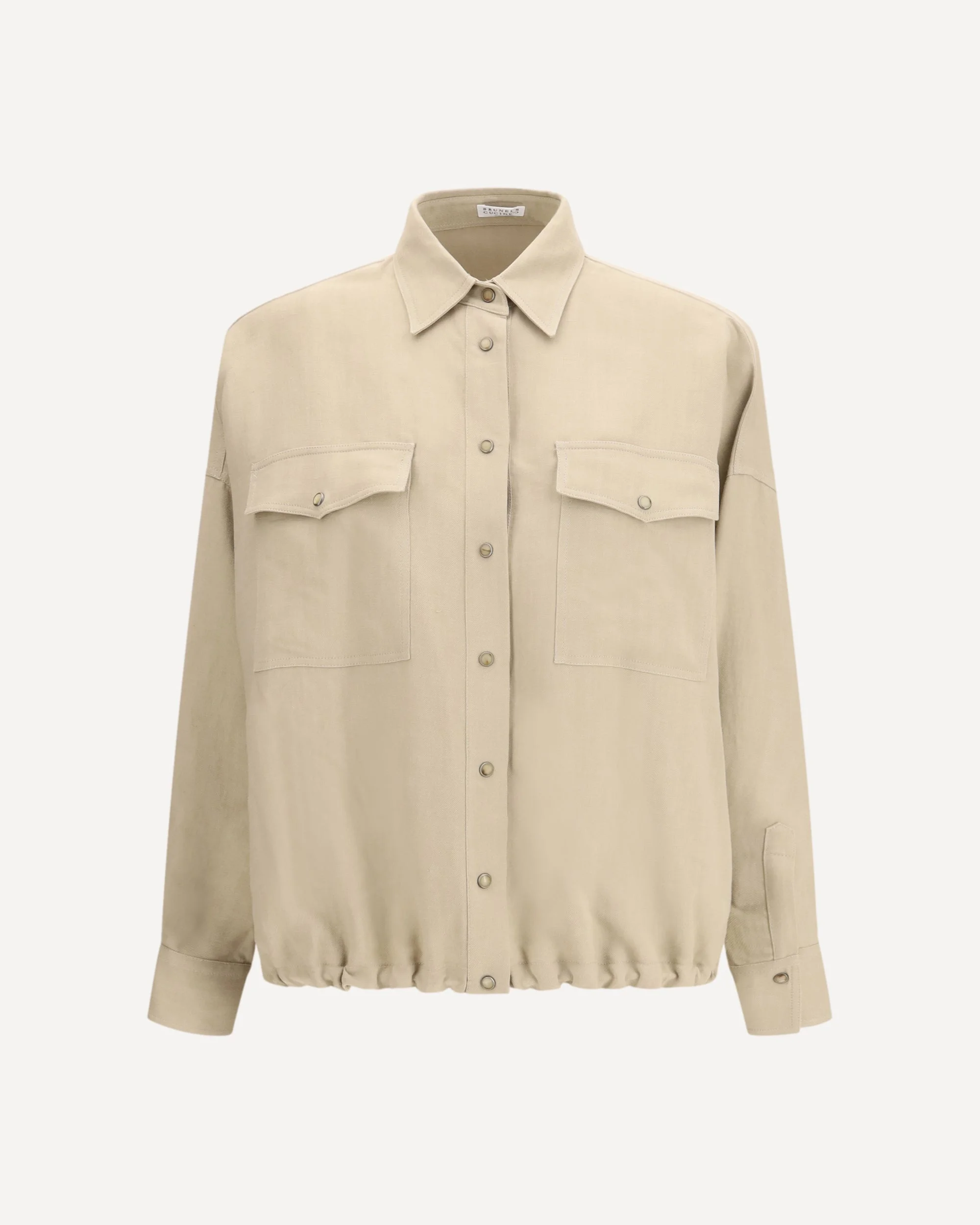 The viscose and linen Fluid twill Shirt by Brunello Cucinelli combines elegance and comfort with a sophisticated design. Featuring a placket closure with snap buttons, a classic collar, and dropped shoulders, it offers a relaxed fit. The snap button cuffs, two patch pockets with flaps and buttons on the chest, and drawstring hem add practicality and style. A versatile and modern garment, perfect for any occasion. DETAILS - Sku: MH126NE416_C9195 - Season: SS26 - Fit: Regular - Composition: GENERAL 72% Viscose 28% Linen - MADE IN ITALY