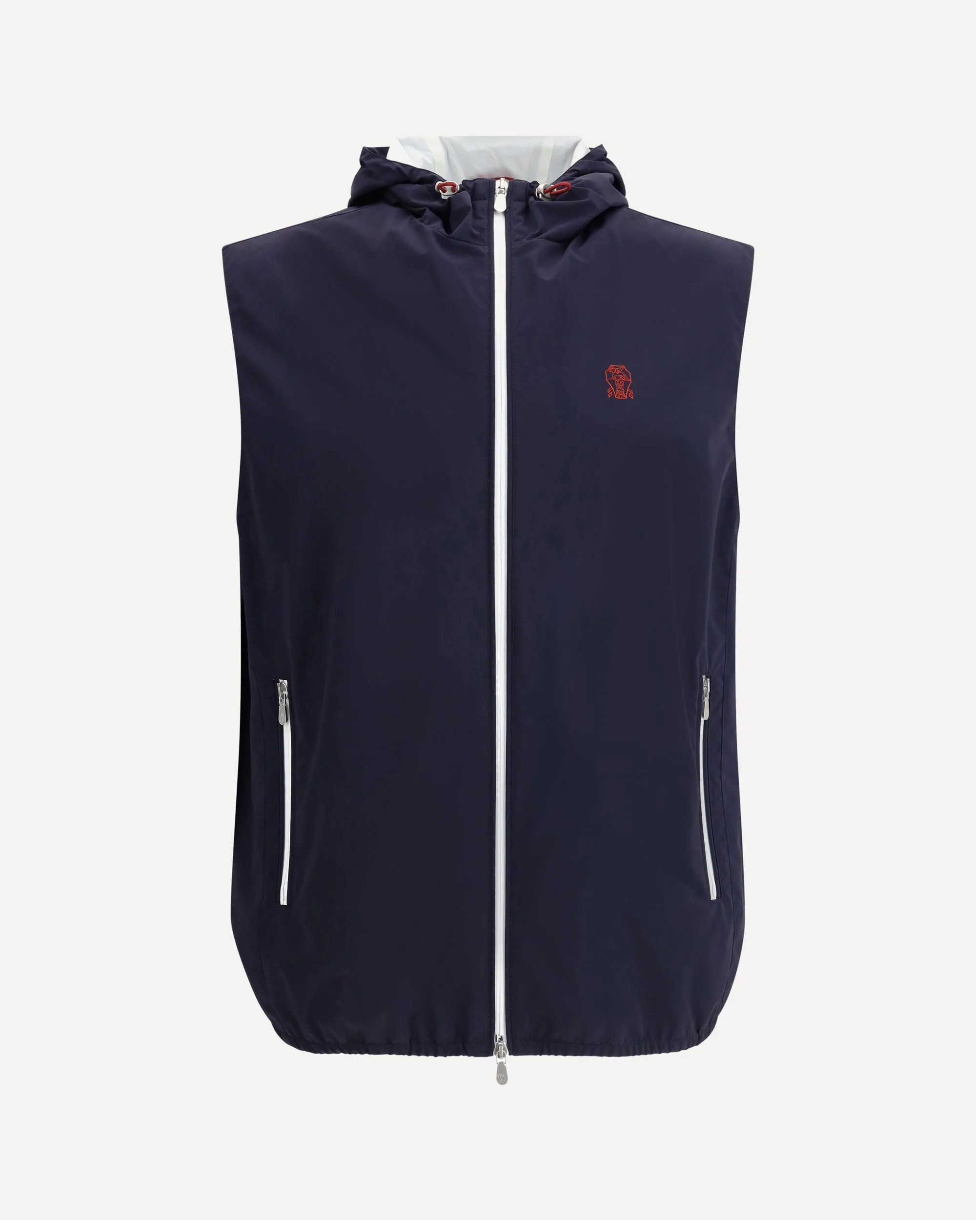 Brunello Cucinelli's waterproof Vest is a functional and sophisticated garment, perfect for adding a touch of luxury to your casual looks. The model features a drawstring-adjustable hood that offers additional protection. The front closure with a double-slider zipper ensures practicality and ease of use. The two zippered side welt pockets provide secure space for your belongings. The brand's iconic contrasting logo on the front adds a distinctive detail, while the elasticized waistband ensures a comfortable fit. With its monochrome pattern and regular fit, this vest is ideal for those seeking a simple yet elegant style without sacrificing functionality. DETAILS sku MM49A7450G_C1086 composition: POLYESTER 100% color group: BLUE gender: MAN season: SS25 size chart: STANDARD category name: BLAZERS e VESTS