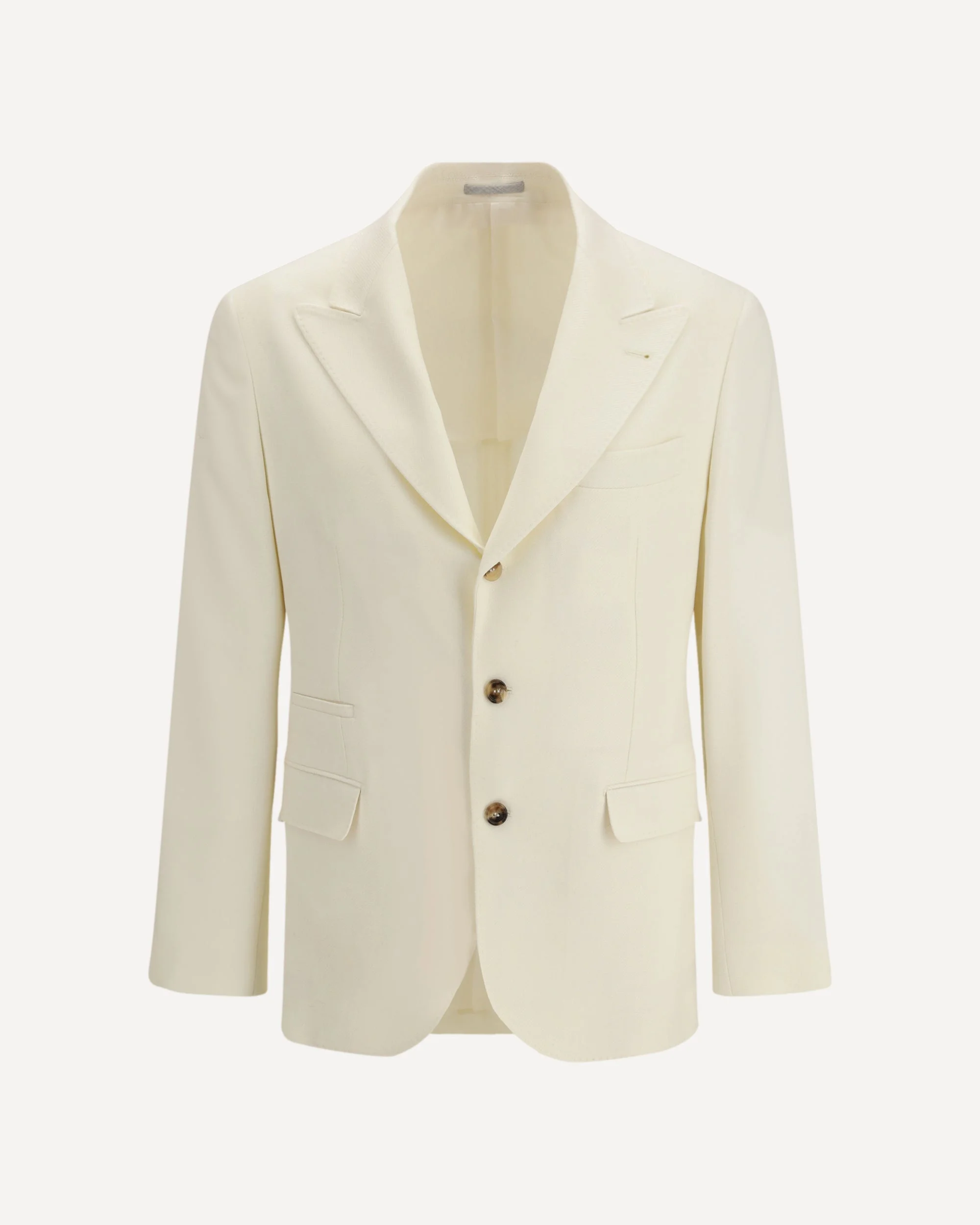 The Jacket by Brunello Cucinelli expresses the wool-blend cavalry fabric through a tailored elegance that balances structure and fluidity. The single-breasted closure with three buttons pairs harmoniously with the wide peak lapel, shaping a style that feels both classic and modern. The sleeves with “Solomeo shoulder” construction and four-button cuffs introduce a distinctive touch, while the welt pockets with flap, the chest pocket and the ticket pocket add refined practicality. Side vents at the back enhance movement, and the partial cupro lining ensures light comfort. Horn buttons complete a piece designed for an impeccable and thoughtful aesthetic. DETAILS - Sku: MV4147BFD_C501 - Season: AW25 - Fit: Regular - Composition: GENERAL 95% Wool 3% Kashmir/capra Hircus 2% Silk - MADE IN ITALY
