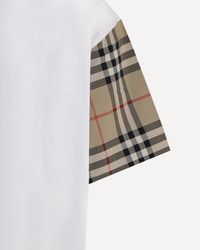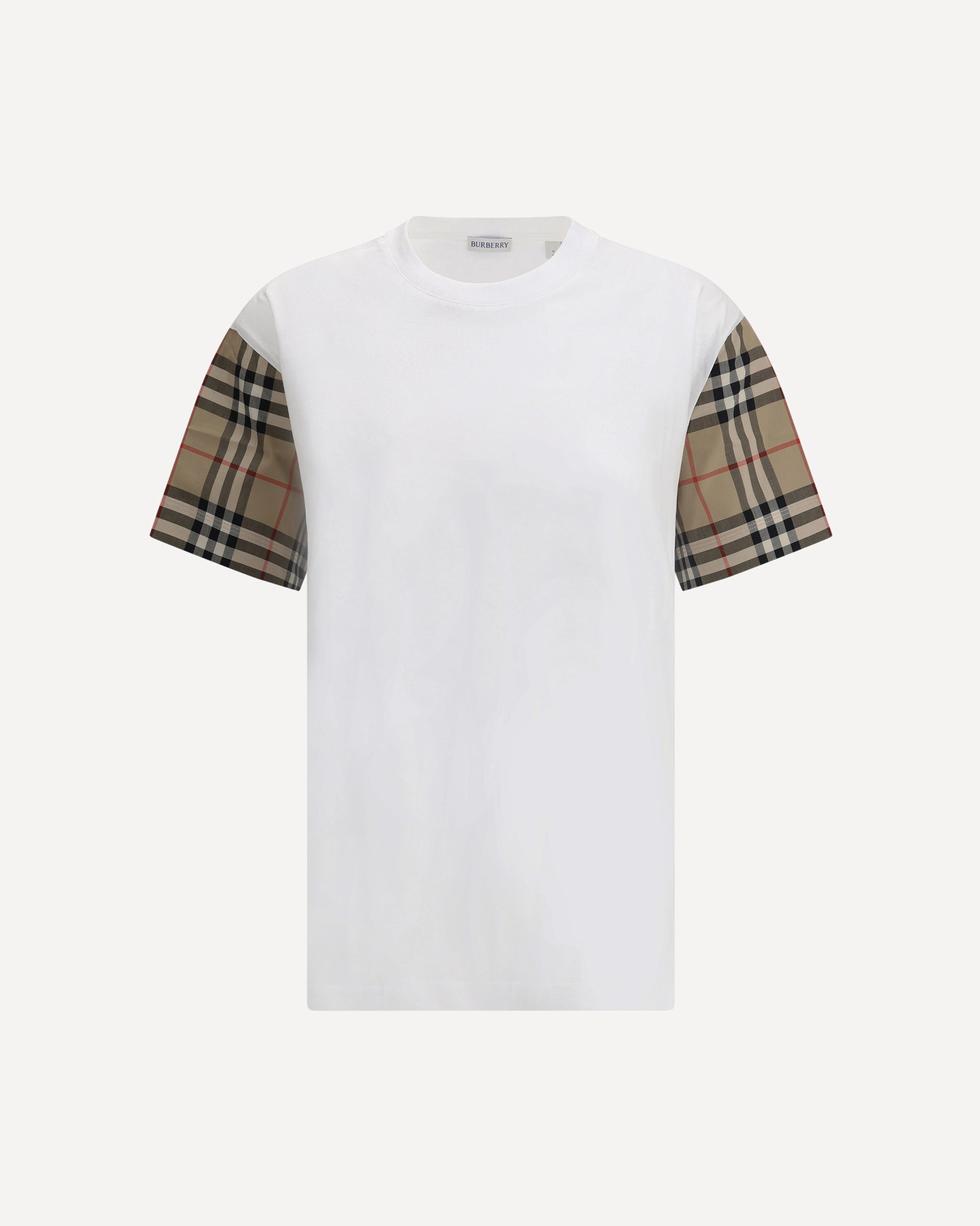 Burberry's Cotton Check Archive Sleeve T-shirt is a garment that combines comfort with distinctive style. Featuring a ribbed collar, this T-shirt features sleeves embellished with the iconic Archivio Check pattern, one of the brand's historic motifs. The simple, clean design of the T-shirt body highlights the sleeves with the famous pattern, creating a stylish and recognizable contrast. DETAILS sku 8073029_A1464 composition: COTTON 100% color group: WHITE gender: WOMAN season: SS25 size chart: STANDARD category name: T-SHIRTS