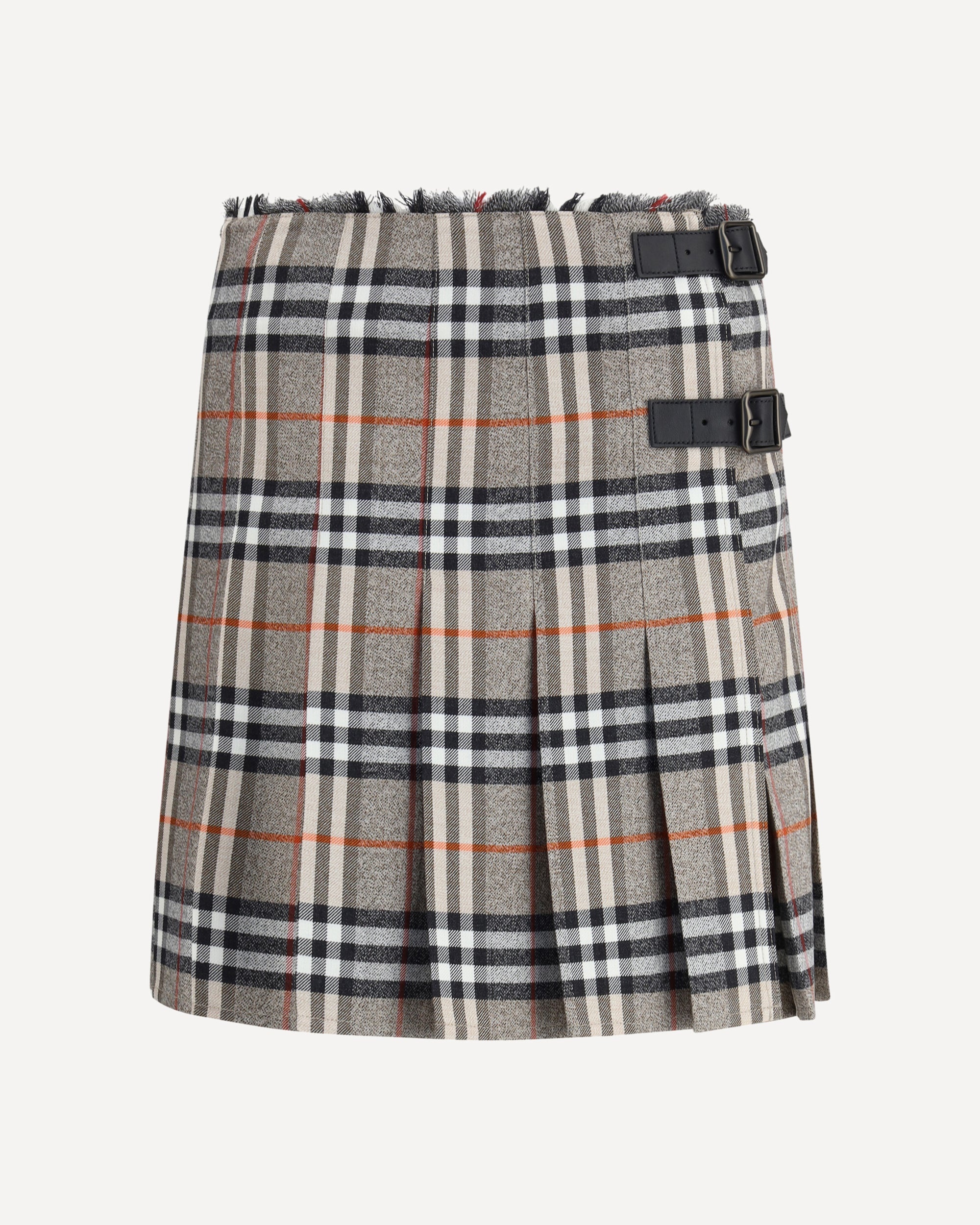 Burberry's Check Archive Wool Miniskirt features a flared silhouette with pleats that give it movement and femininity. The waist is finished with short, thin bangs, while leather straps with a B-shaped buckle allow for tailored adjustment. The side closure is embellished with buttons and a buckle engraved with Burberry lettering, a refined detail that celebrates the brand's distinctive elegance. DETAILS - Sku: 8113042_C3142 - Season: AW25 - Fit: Slim - Composition: GENERAL 100% Wool - MADE IN POLAND