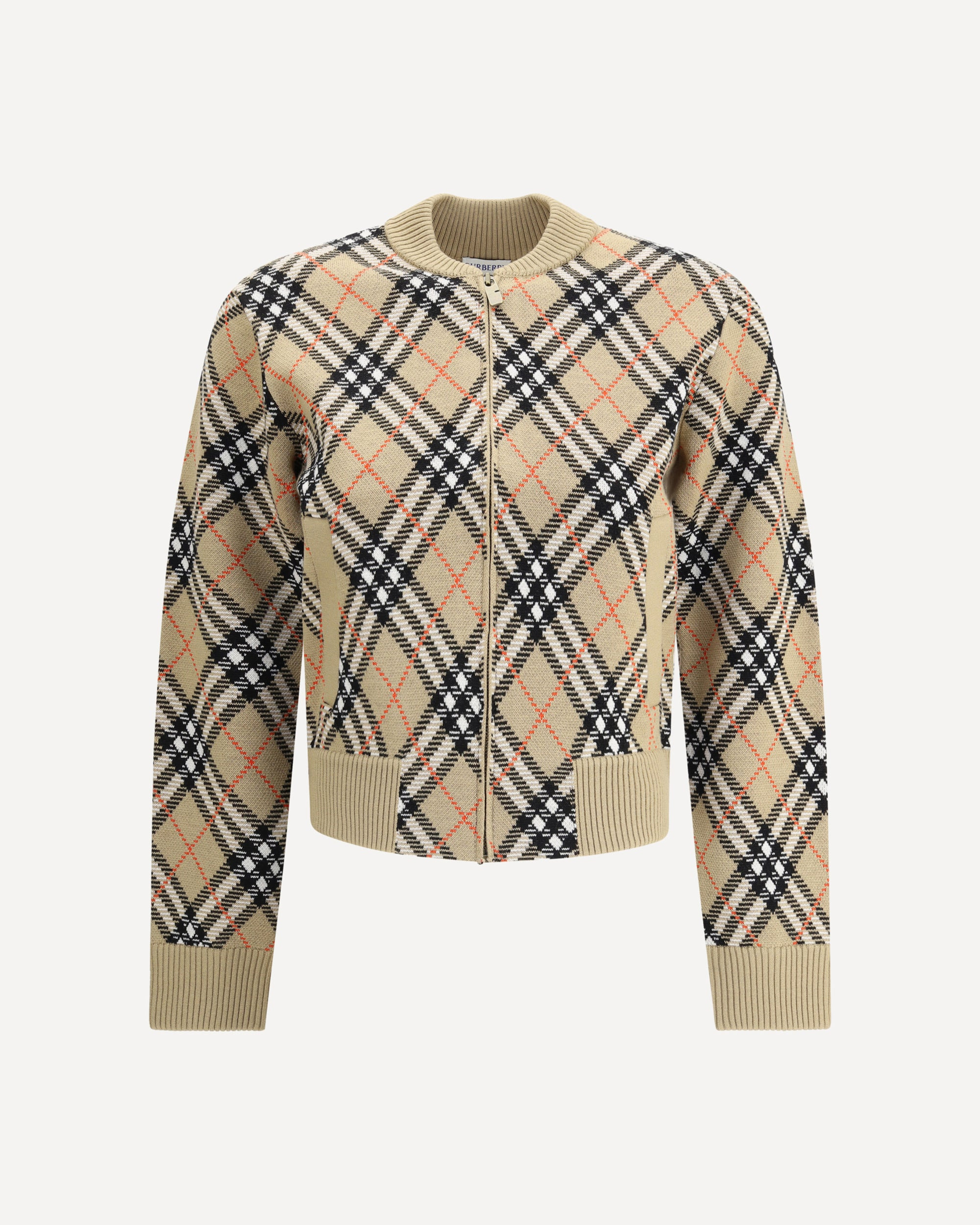 Burberry's Check Cardigan is a casual-inspired garment enhanced by the house's unmistakable check pattern. Featuring a front zipper closure, it has a ribbed collar, hem and cuffs for a comfortable, fitted fit. The two side welt pockets add practicality, making it perfect for an everyday look with an iconic touch. DETAILS - Sku: 8110607_C1309 - Season: AW25 - Fit: Regular - Composition: GENERAL 91% Wool 9% Polyester - MADE IN ITALY