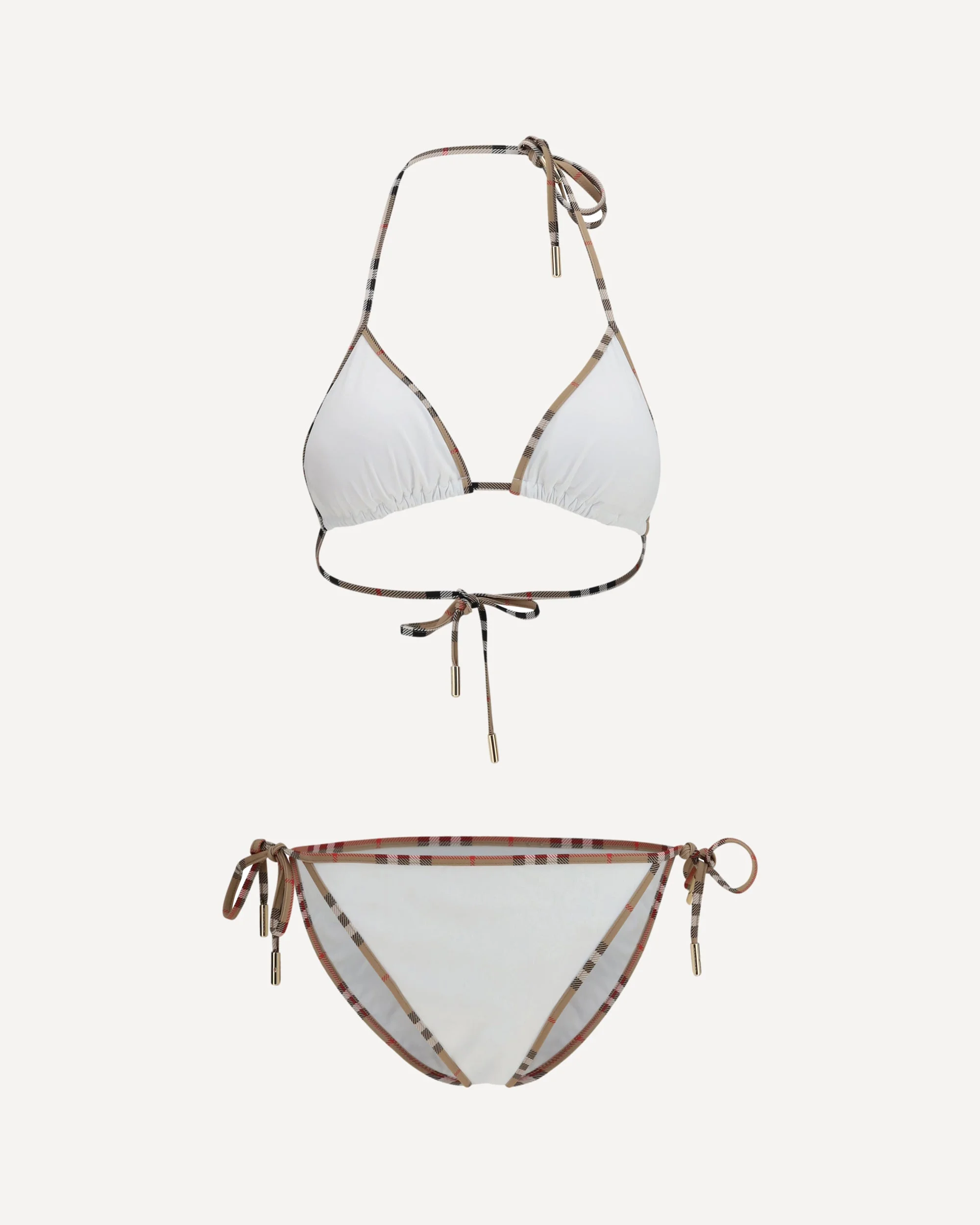 The Check Detail Triangle Bikini by Burberry is defined by the signature check pattern that reflects the identity of the brand. It features a halter neck tie fastening, removable padded cups and bottoms with adjustable side ties. The clean design enhances the silhouette with a distinctive and modern Burberry attitude. DETAILS - Sku: 8070464_A1464 - Season: SS26 - Fit: Slim - Composition: GENERAL 71% Polyamide 29% Elastane - MADE IN PORTUGAL