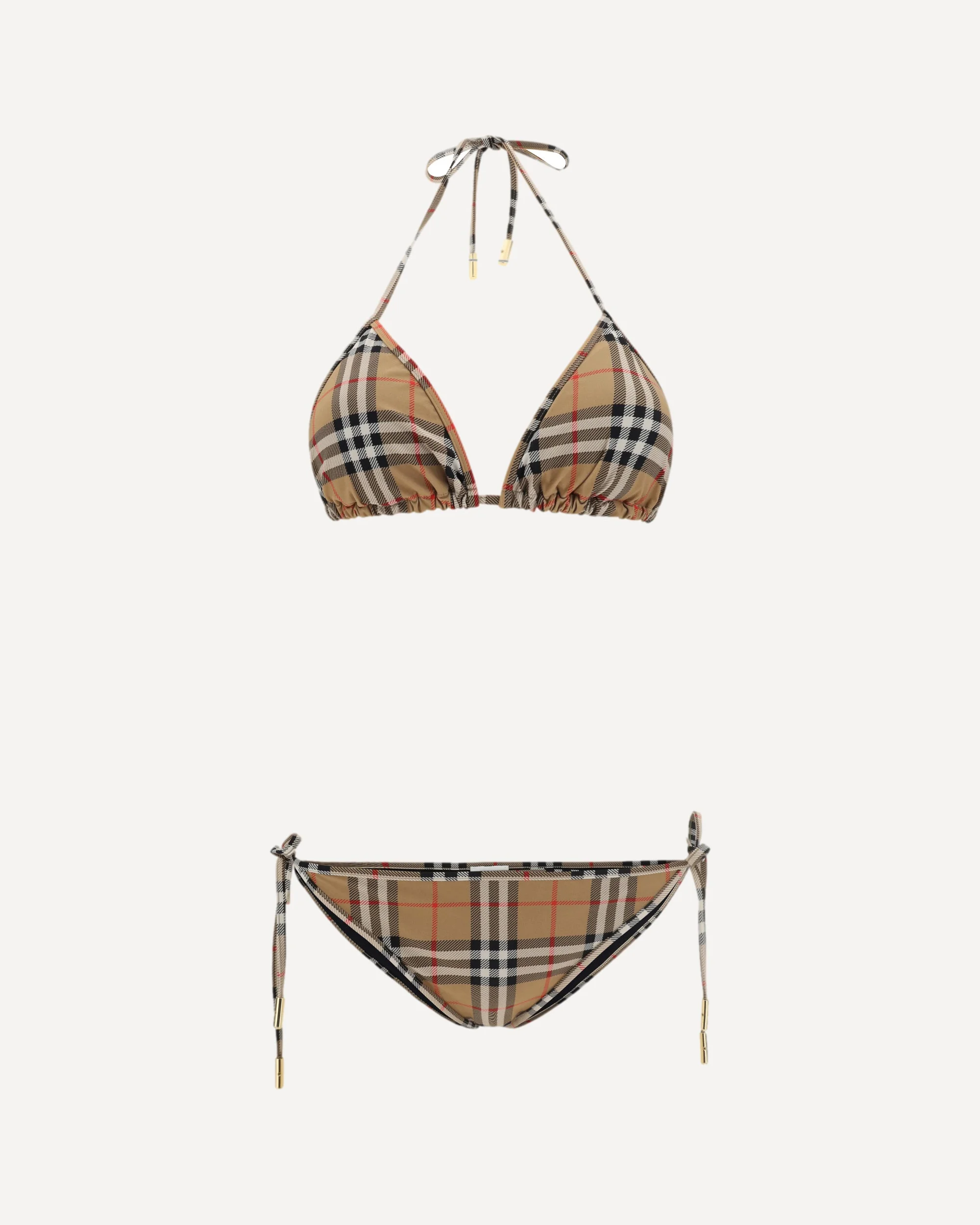 Cobb Swimsuit by Burberry, bikini model, design with iconic all-over archival check pattern, sliding triangle top, lace-up closure at back of neck, adjustable matching bottom with side ties. DETAILS sku 8009008_A5145 composition : ELASTANE 27% POLYAMIDE 73% color group : BROWN gender : WOMAN season : SS24 size chart : WOMAN STANDARD category name : SWIMWEAR