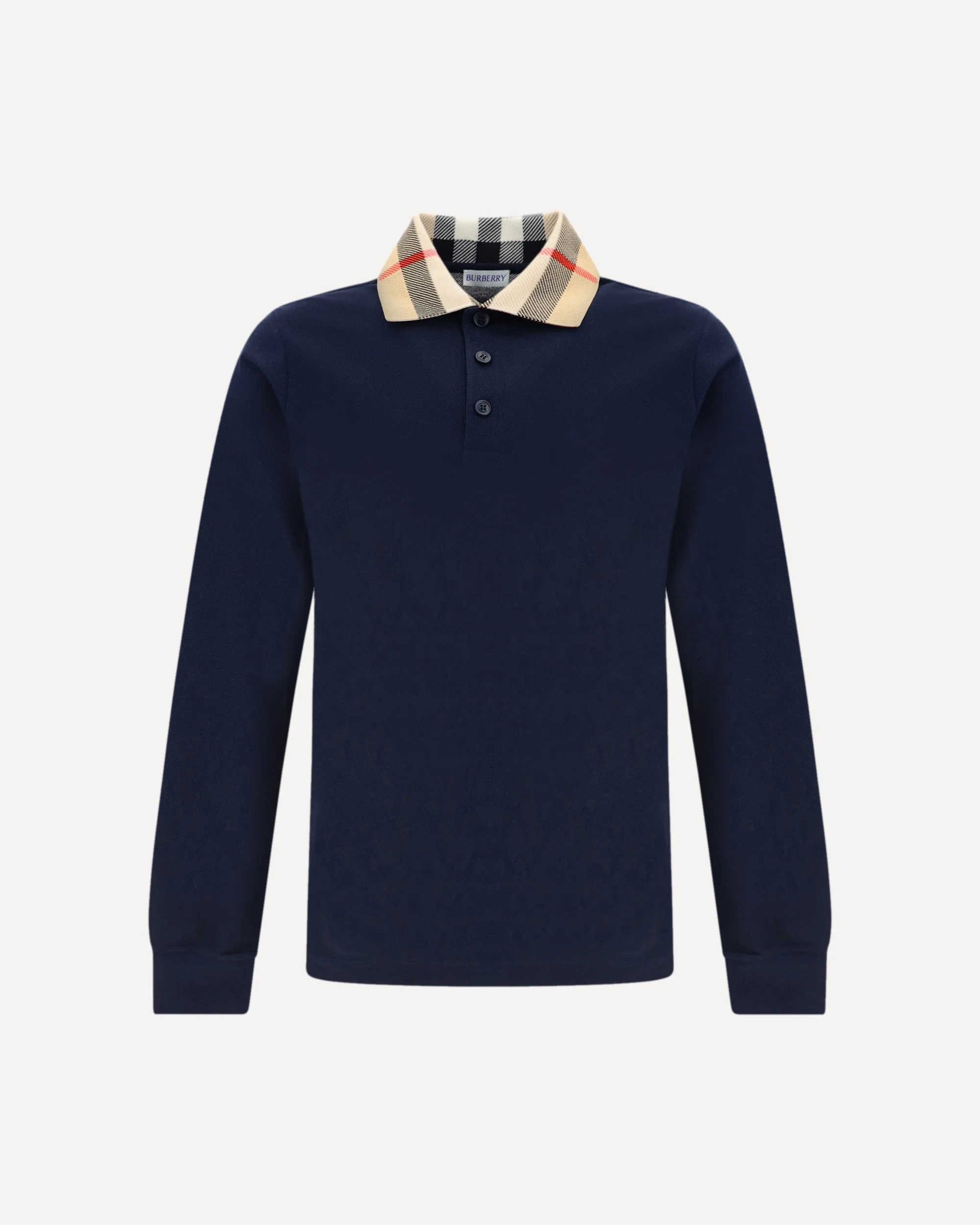 Cotton Cody Polo Shirt by Burberry, long-sleeved design, classic ribbed collar with iconic Archivio Check pattern, tone-on-tone front buttons, monochrome pattern, regular fit. DETAILS sku 8098813_B3590 composition: COTTON 100% color group: BLUE gender: MAN season: AW24 size chart: STANDARD category name: POLO SHIRTS