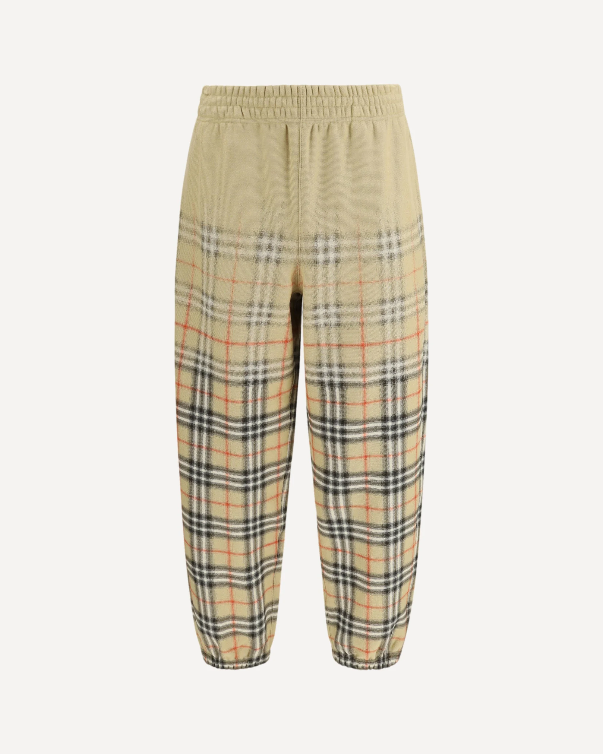 The cotton Sweatpants by Burberry with a faded check pattern offer the perfect blend of comfort and style. Crafted from lightweight terry cotton, they feature a comfortable, relaxed fit. The design is enhanced by the Burberry check print, which gradually fades into a solid color for a unique and sophisticated look. The internal drawstring waist and side patch pockets, together with the back patch pocket, add practicality without compromising on casual elegance. DETAILS - Sku: 8119036_B9368 - Season: SS26 - Fit: Regular - Composition: GENERAL 100% Cotton - MADE IN PORTUGAL