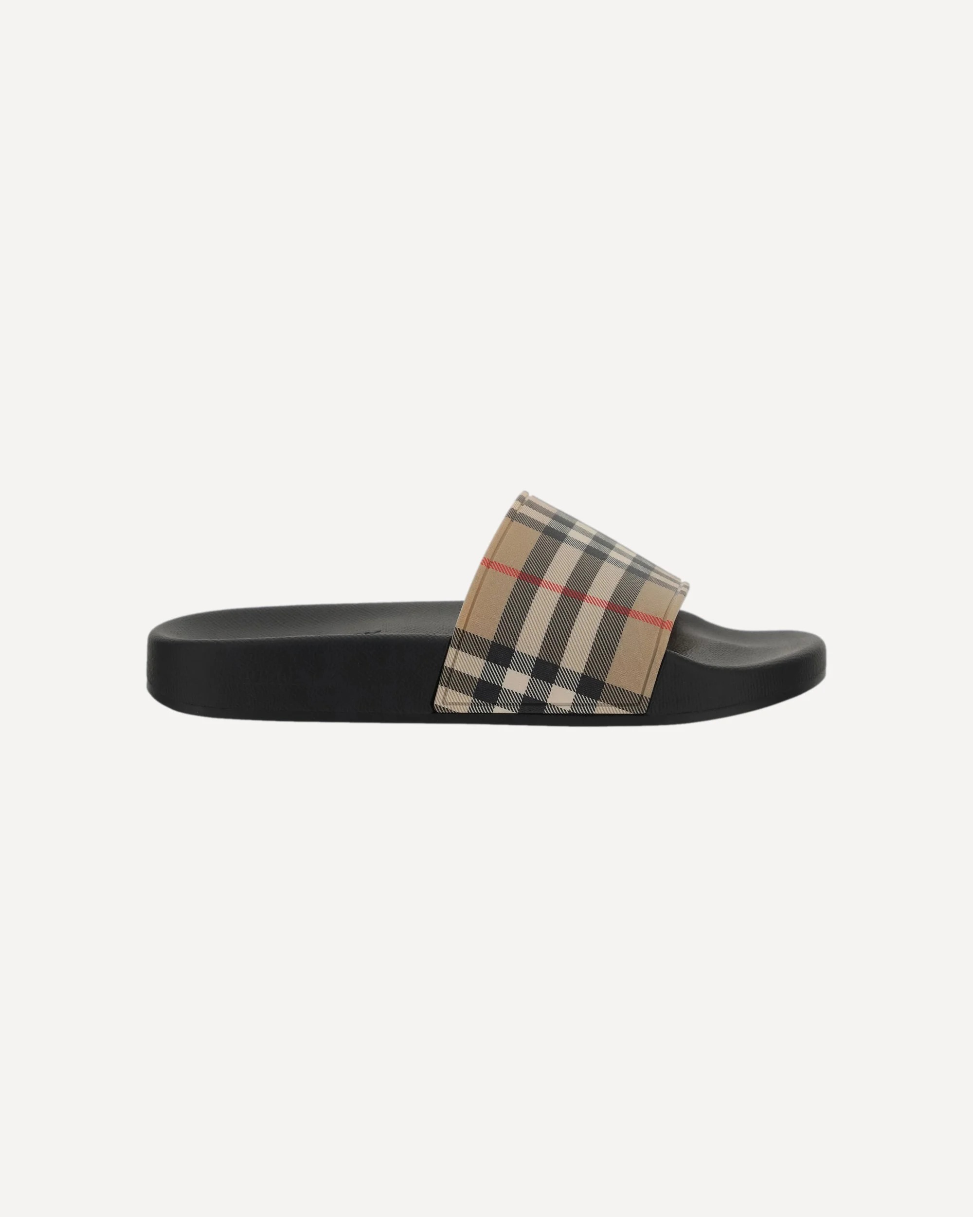 Furley Sandals by Burberry, unique wide front band with the brand's iconic check pattern, flat sole, round toe, and logo-embossed insole. DETAILS sku 8057037_A7028 composition: POLYURETHANE 100% RUBBER 100% color group: MULTICOLOUR gender: WOMAN season: SS25 size chart: SHOES IT category name: SANDALS