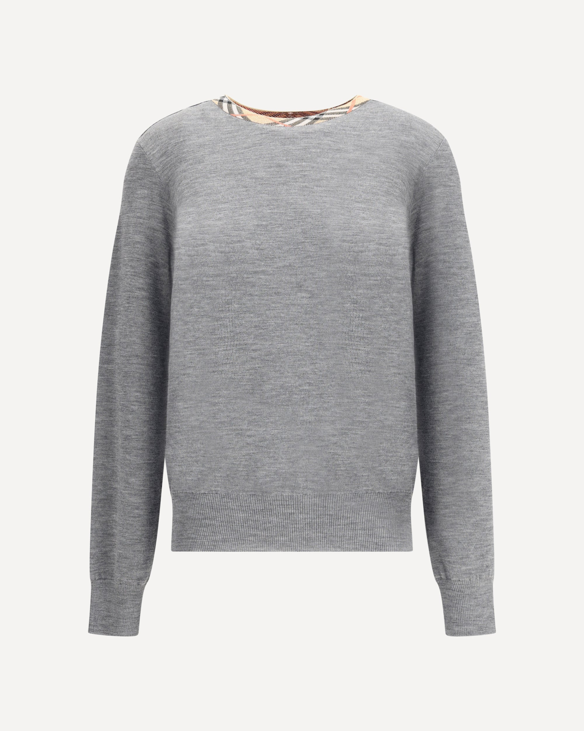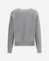 Burberry's Wool Pullover with Check trim is an understated yet distinctive homage to the British fashion house's iconic style. Made from soft wool, this design features the Burberry Check pattern knitted directly on the collar, a refined detail that adds a touch of recognition without being overdone. Ribbed trim on the collar, cuffs and hem complete the design, giving a defined and comfortable fit. A perfect garment for those seeking contemporary elegance and quality tailoring. DETAILS - Sku: 8112171_A1345 - Season: AW25 - Fit: Regular - Composition: GENERAL 93% Cotton 6% Polyamide 1% Elastane - MADE IN ROMANIA