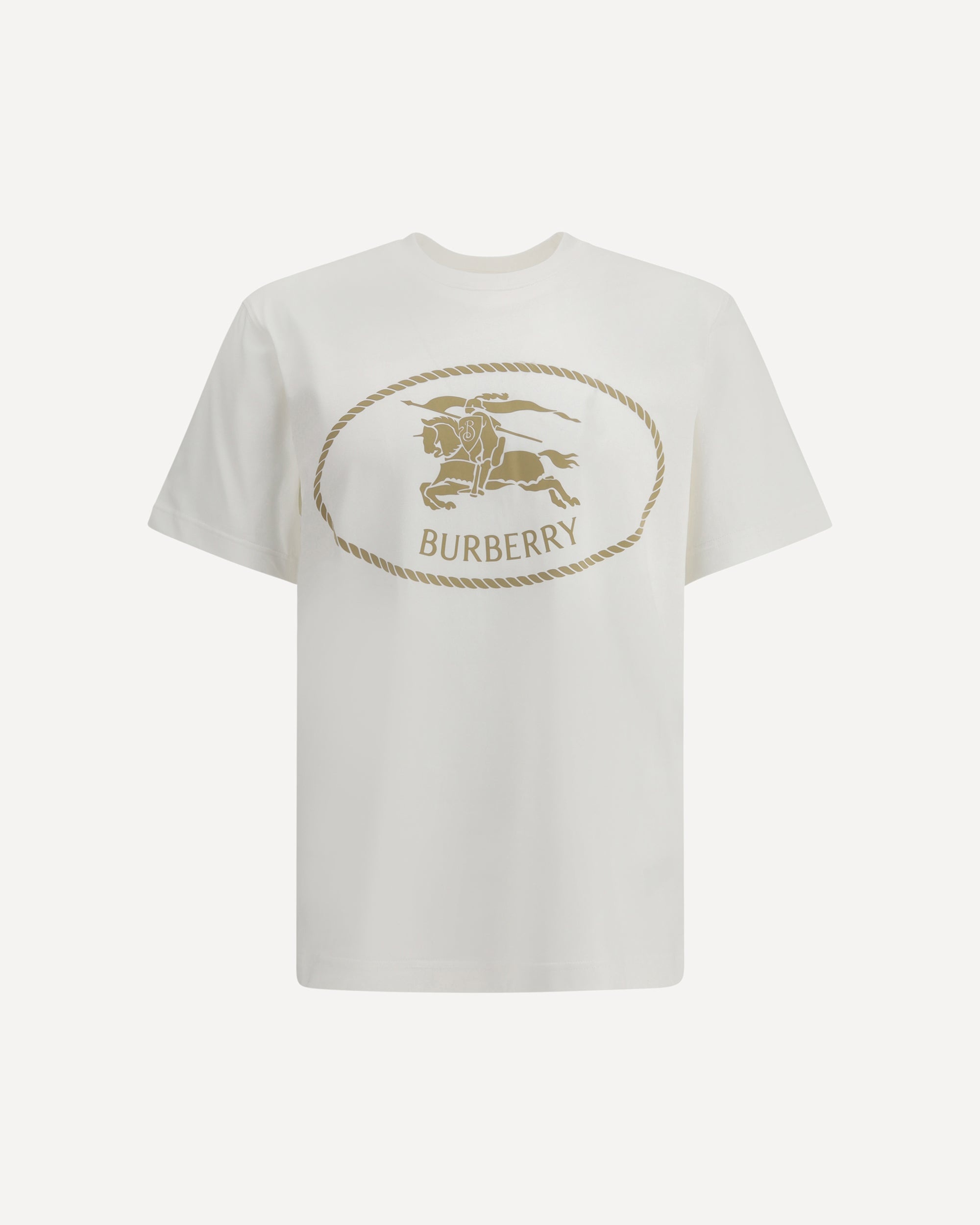 Burberry's T-Shirt encapsulates the essence of the brand with its refined design and the iconic Equestrian Knight printed on the front. Made from high-quality cotton, it features a ribbed crew neck that ensures a comfortable and versatile fit. Burberry's signature Equestrian Knight motif gives the look a traditional and modern twist, making this T-shirt perfect for those looking for an elegant yet casual style. DETAILS - Sku: 8110112_B7078 - Season: AW25 - Fit: Regular - Composition: GENERAL 100% Cotton - MADE IN VIETNAM