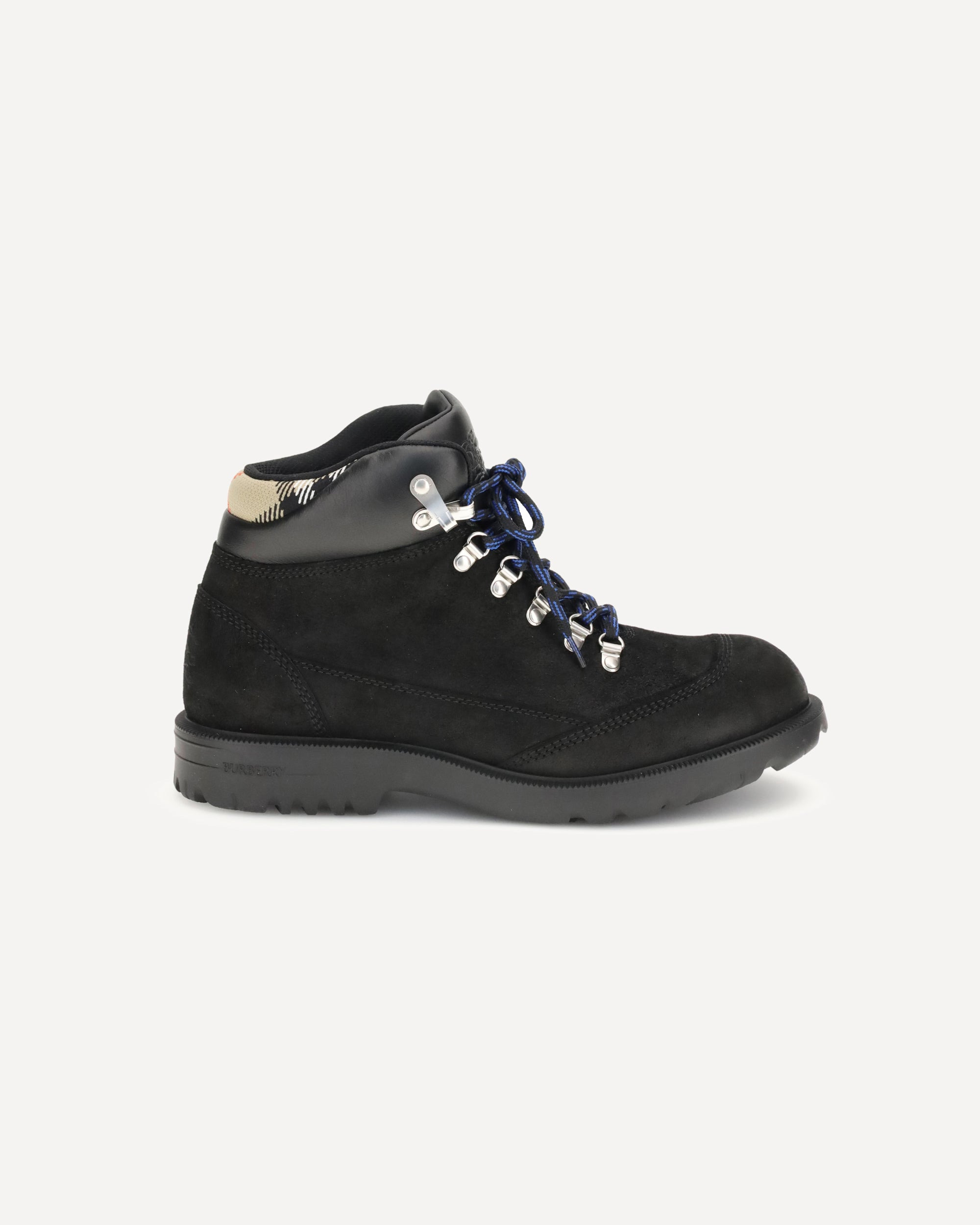 Burberry's Moor hiking Boots combine technical style and iconic details. Made in Italy from suede, they feature a lightweight sole and leather padding at the ankle, enhanced by a Burberry Check patterned knit insert in the signature sand color. The Equestrian Knight Design is embroidered on the back, while the laces feature stripes in Knight Blue. A lace-up closure, round toe and engraved logo on the sole complete the design. DETAILS - Sku: 8111674_A1189 - Season: AW25 - Composition: UPPER 70% Calf Leather Bos Taurus 20% Lamb Ovis Aries Aries 9% Polyamide 1% Elastane SOLE 100% Thermoplastic Polyurethane - MADE IN ITALY
