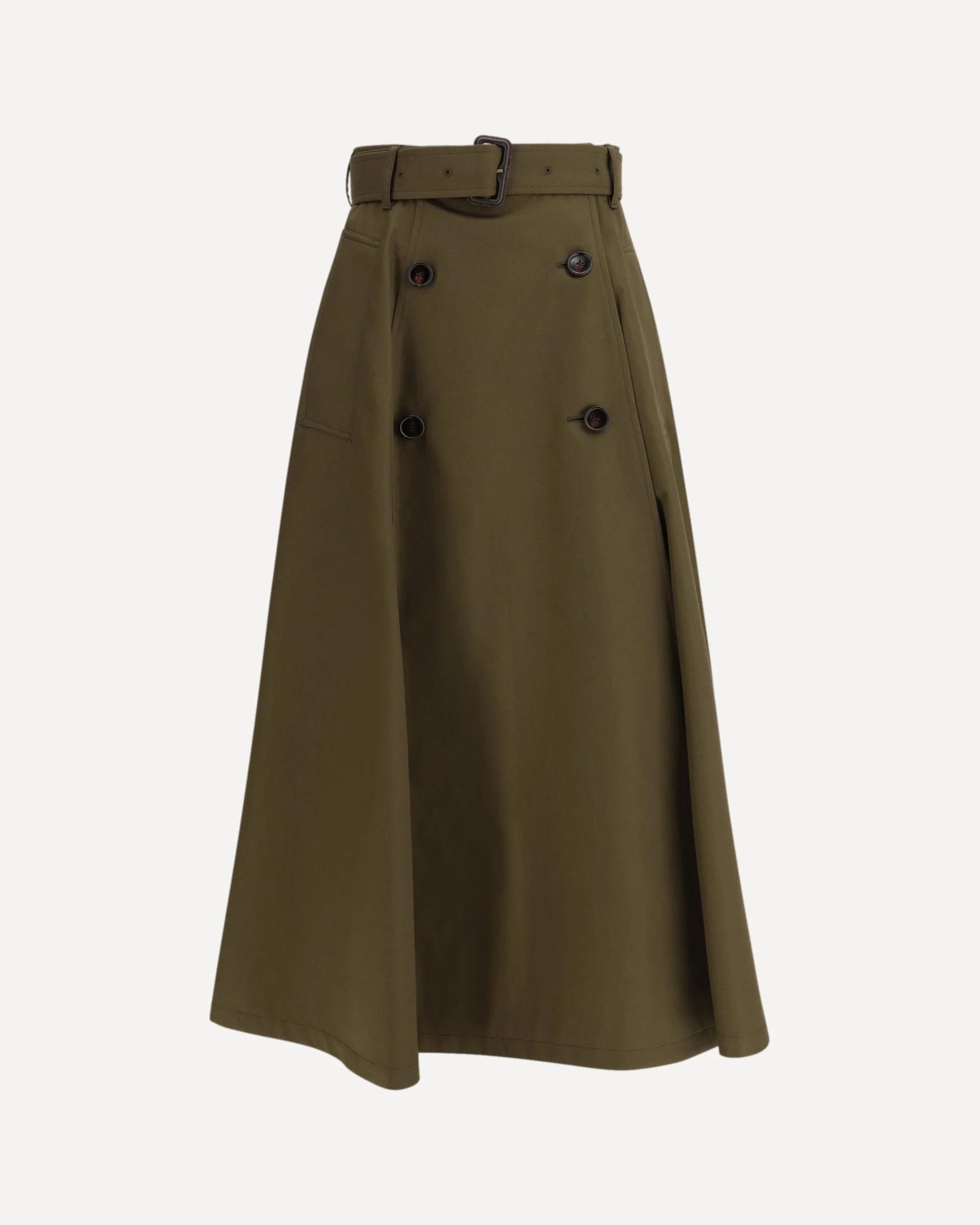 The trench midi Skirt by Burberry reimagines an iconic house style with contemporary elegance. Crafted from water-resistant cotton gabardine, it features a wrap closure with button and hook for a clean, structured look. The high-rise waist with belt loops is finished with a matching adjustable and removable belt, detailed with a leather B buckle, an iconic signature. Side welt pockets add discreet functionality, completing this refined, versatile piece. DETAILS - Sku: 8117977_C1764 - Season: SS26 - Fit: Regular - Composition: GENERAL 100% Cotton - MADE IN GREAT BRITAIN